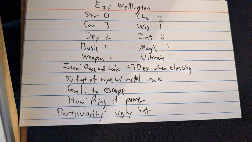Last night I broke out the D&D writing prompt book. I prefer not to play D&D at the moment as I am currently running an Index Card RPG game, so I focused on this while attempting this first prompt.