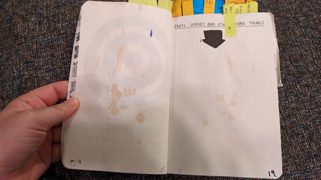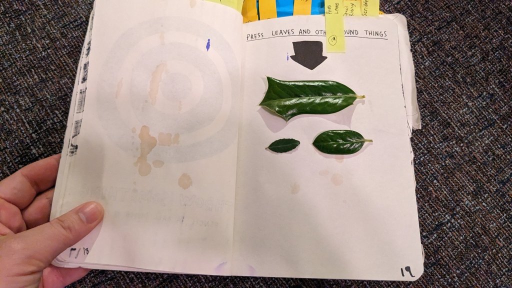 While traveling to the front office to deliver this post card (which I can do again because our postal courier is back again and picking up outgoing mail unlike his replacement) I gathered a few leaves to press into Wreck This Journal.
