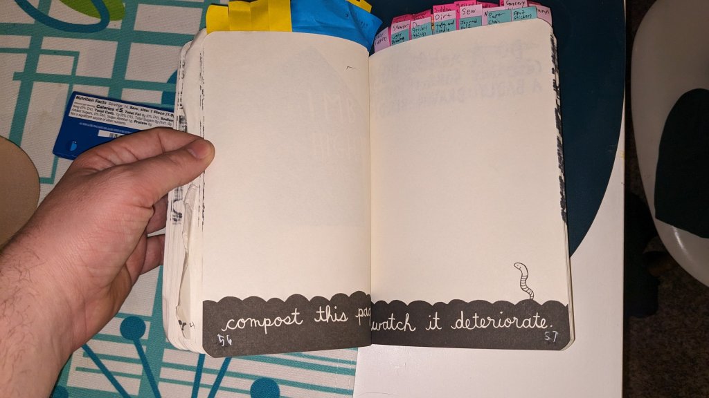 I’ve been slow with Wreck This Journal this week and I have over one-hundred pages to complete so there should be plenty of time to complete this challenge.