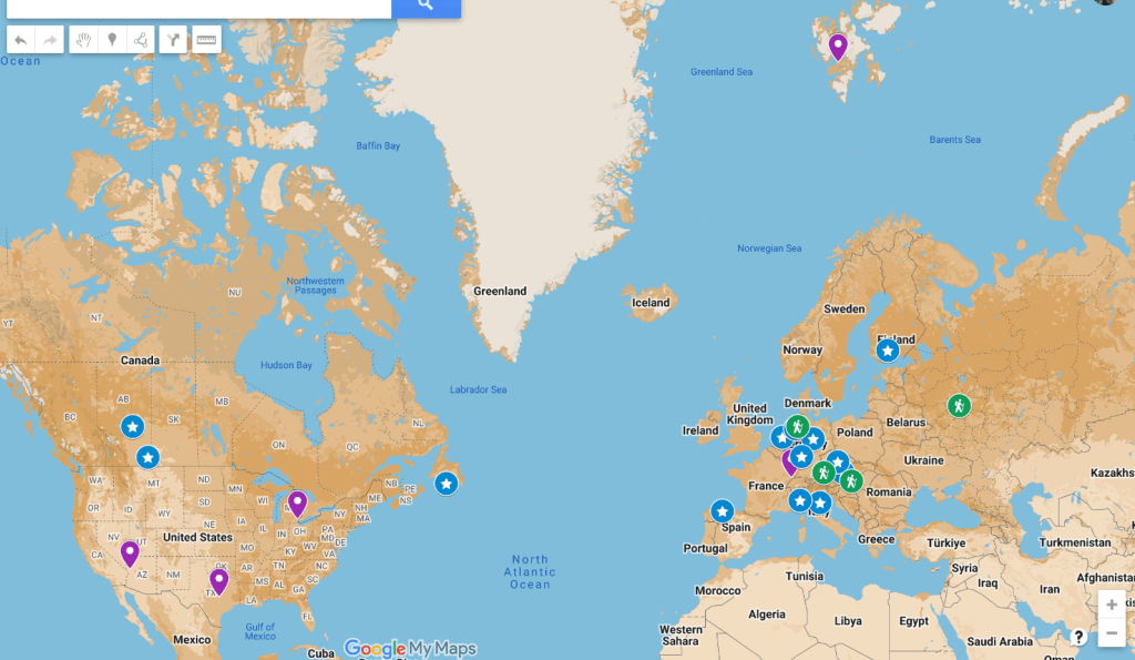 Here is my current postcard map. Blue stars are cards I have sent, green walky guys are cards I have received and all others are cards that I have sent outside of postcrossing.com.