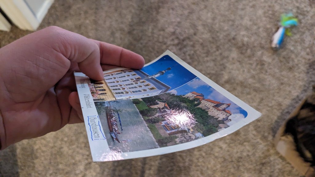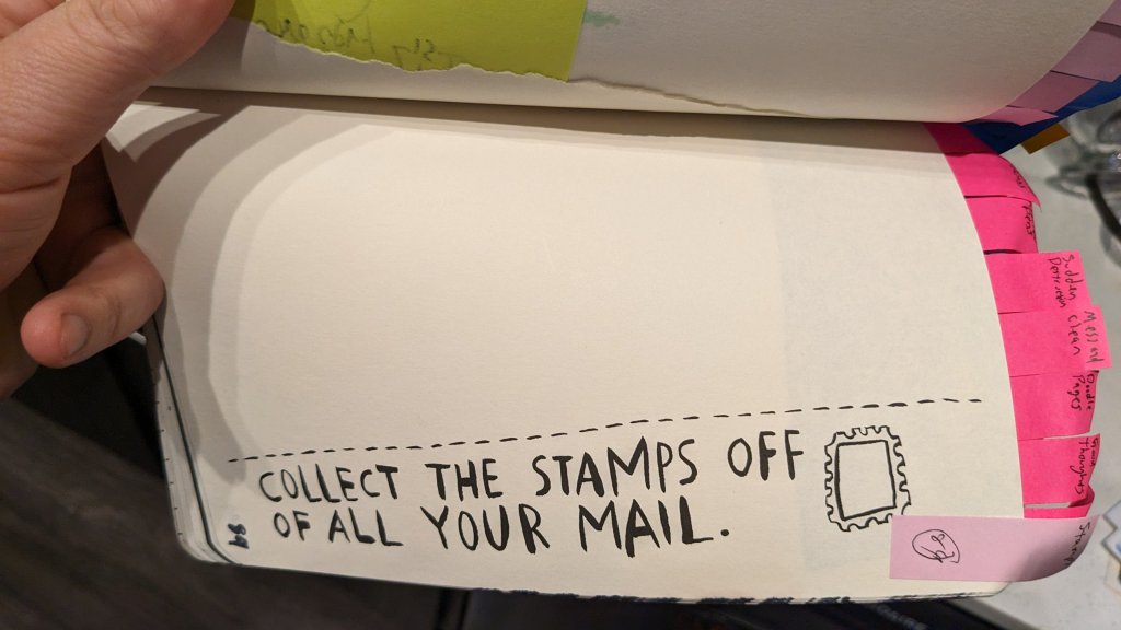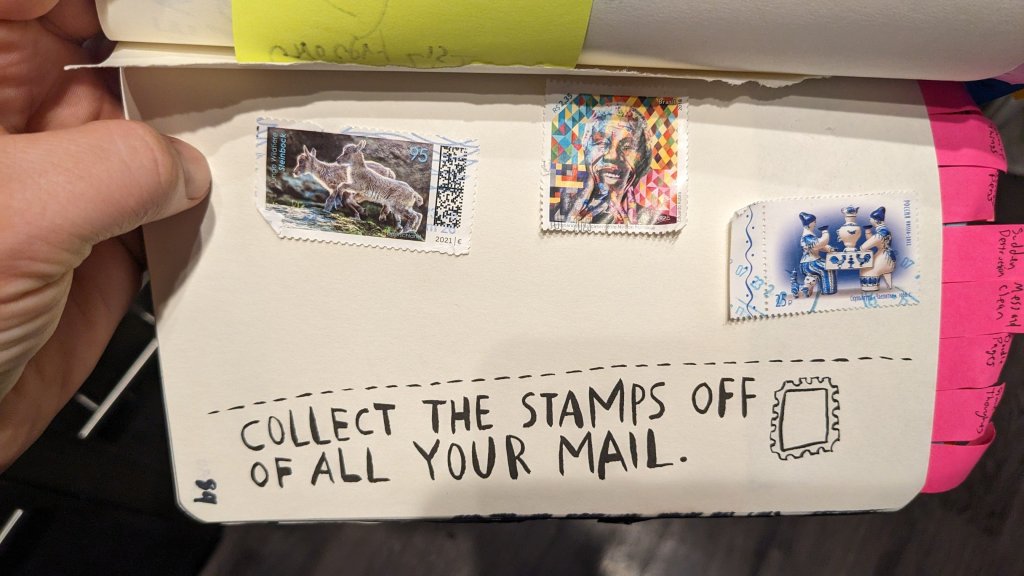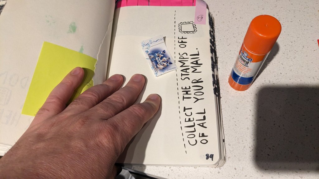 Today I am noticing that some of the Wreck This Journal pages are a bit dated. I was going to work on another page that required a newspaper, but I was unable to find the newspaper that I thought we had at our apartment. Not sure where that went. This quest had me thinking “How difficult will this challenge be in the coming years?” and I turned to another challenge which was this stamp challenge. I don’t know if any of the mail I receive regularly has stamps on it. Luckily thanks to postcrossing I get postcards and extra luckily the kind Russian person who sent a card was very careful to leave one stamp attached loosely so that it could be preserved. What a nice thought.