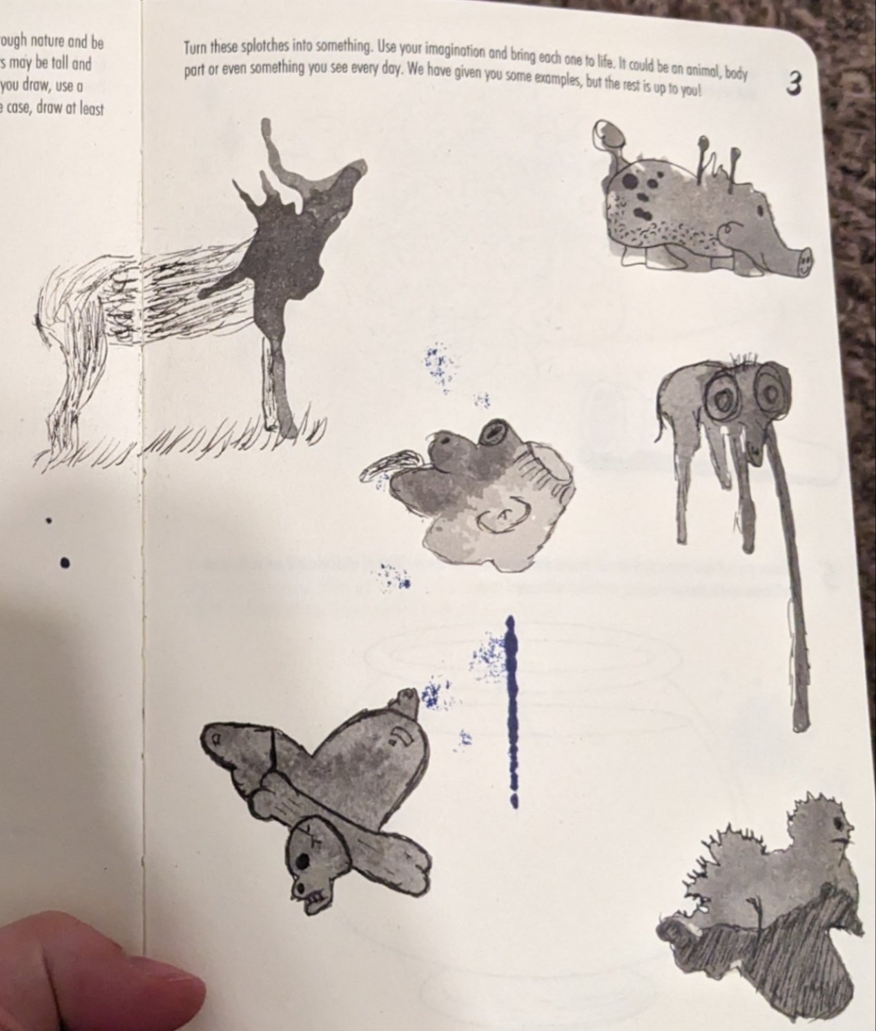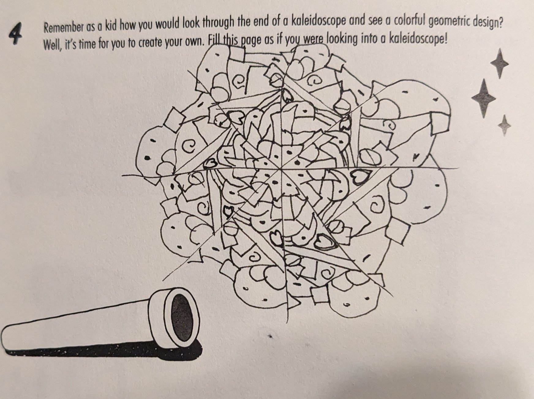Drawing a kaleidoscope image is tricky, but fun. The ink blot doodles were a lot of fun. Highly suggest.