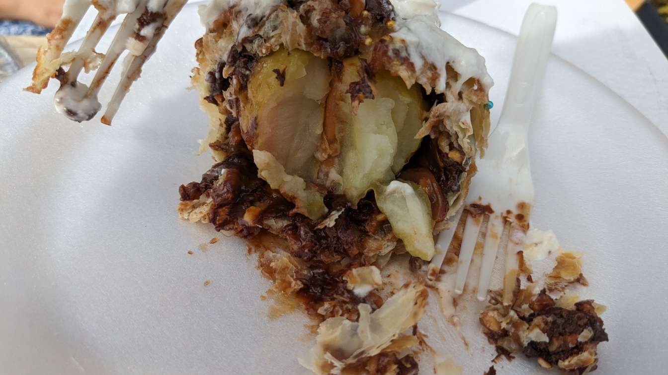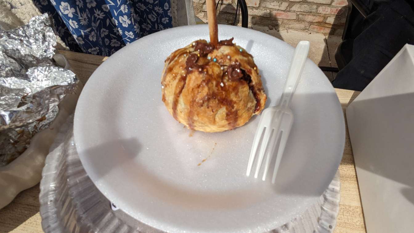 While peeking in here, I saw a small stand selling pie away from the hustle and bustle of the main area. It turns out that I had met a couple who had just moved to Cisco, Texas and who had also missed the deadline to enter their pies into the contest and so they purchased a license to open a stall outside of that area to sell their warez and I ate a caramel apple that had been coated in chocolate and a crust.