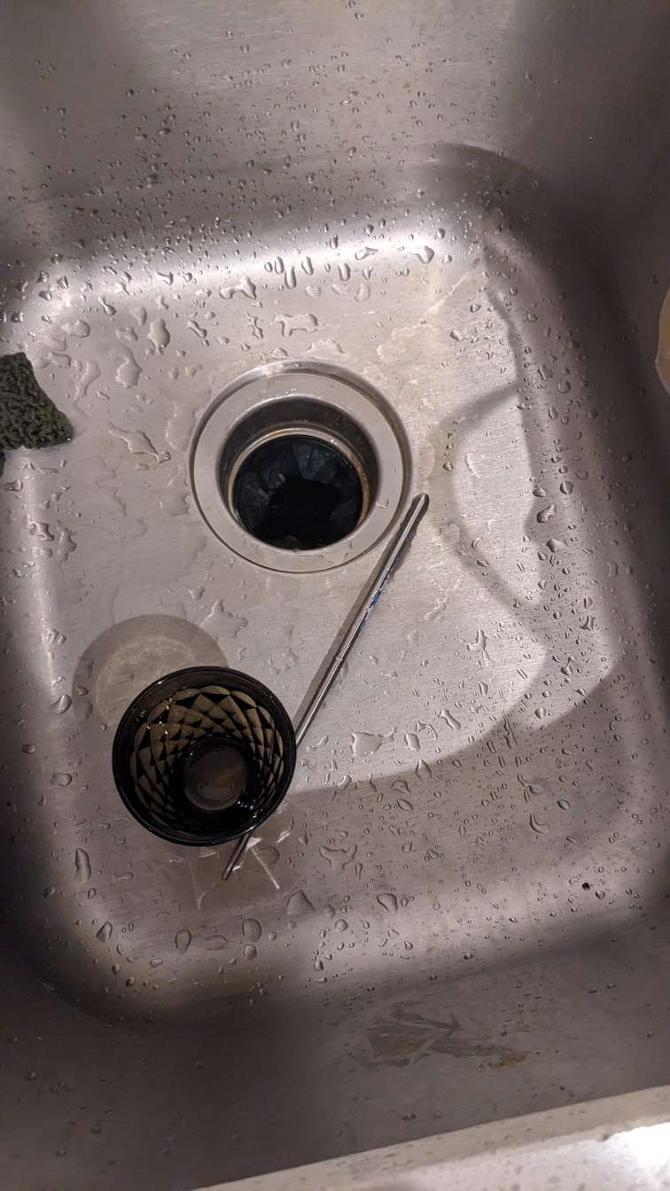 Unfortunately the water level had not gone down any further. I grabbed a metal chopstick to poke around to see if something had gotten jammed up in the garbage disposal, but when poking around the drain felt too shallow… Like there was a small cup sitting in the drain that was holding the water and why it was not draining and perhaps also setting off a safety feature to stop the garbage disposal from running…