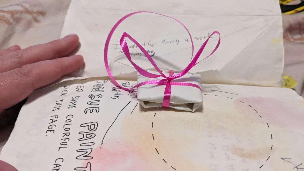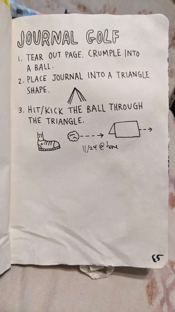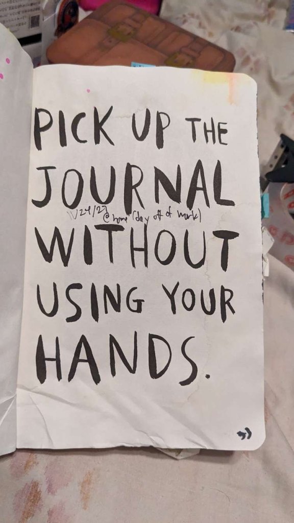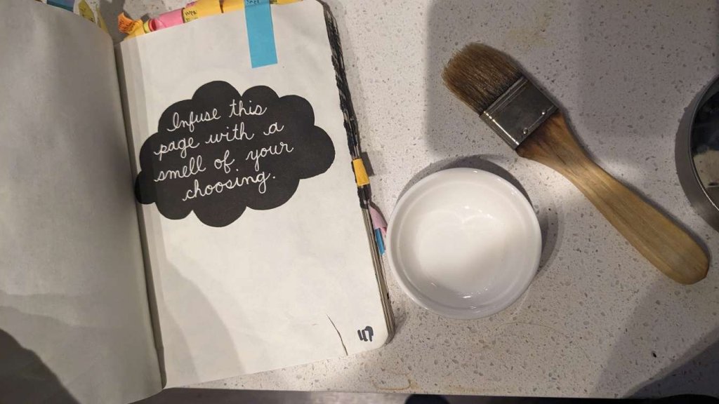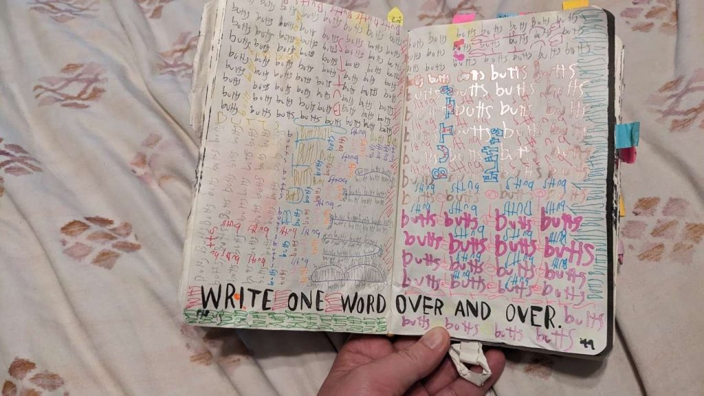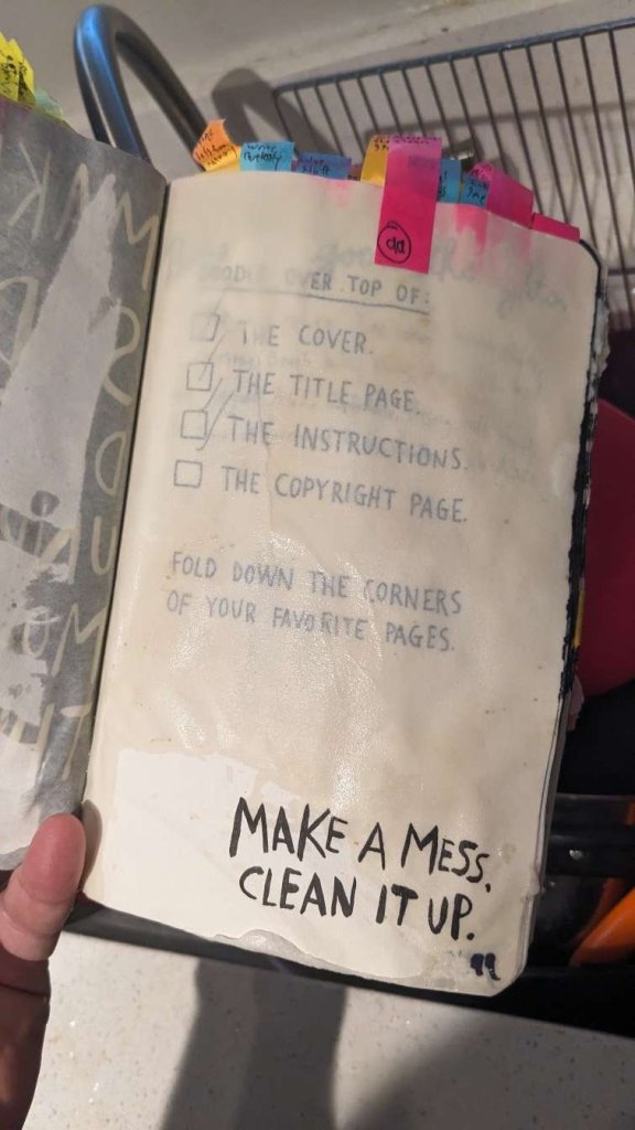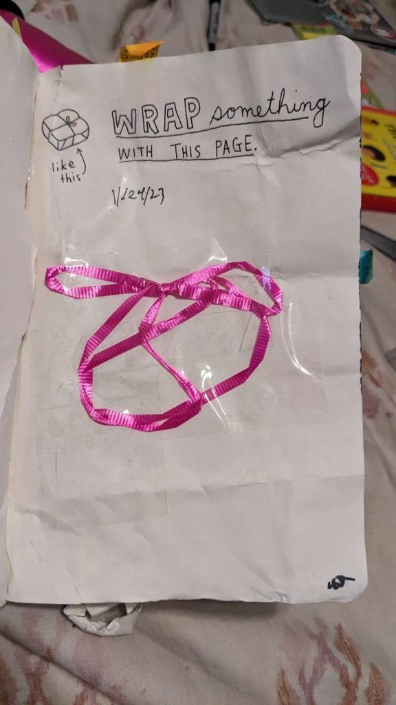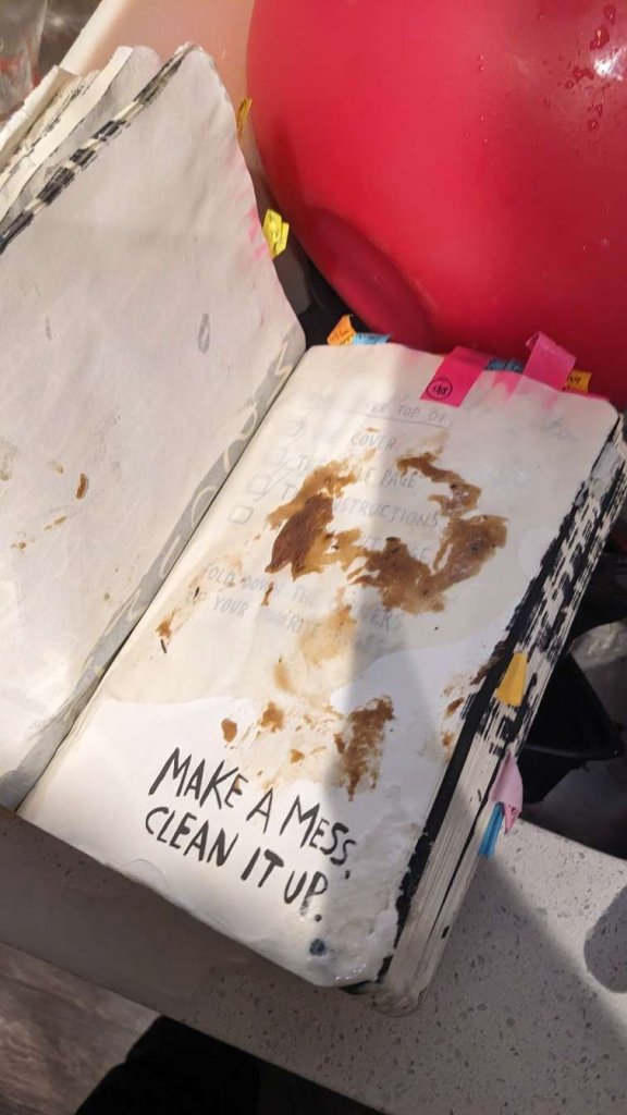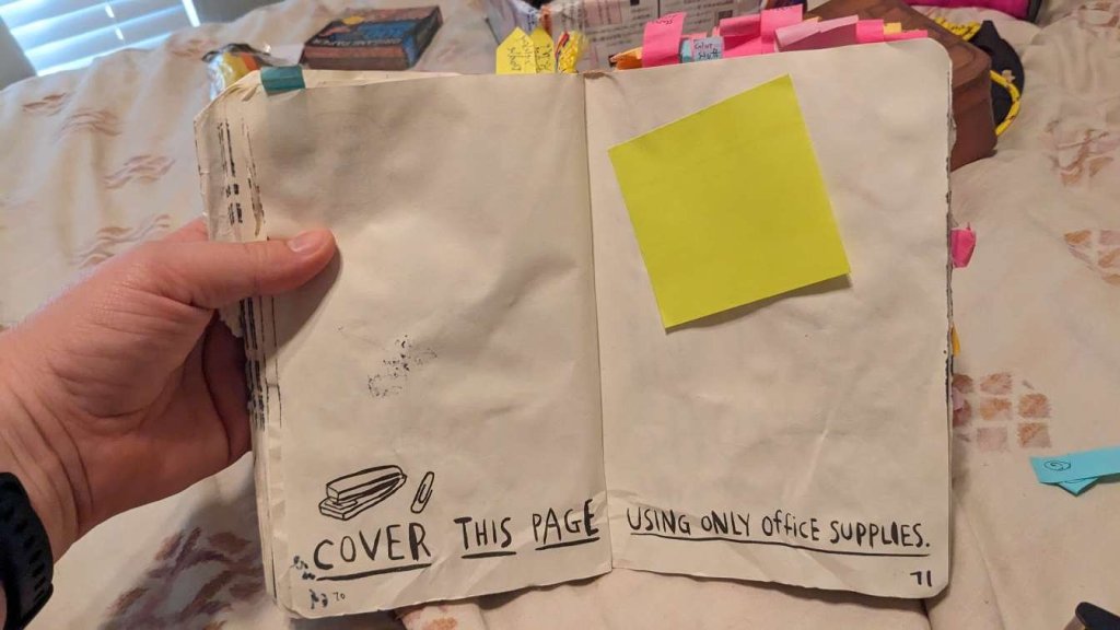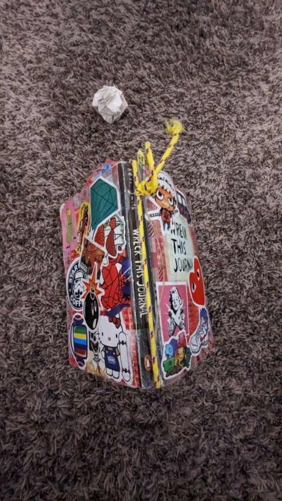 This copy of Wreck This Journal now sits open when laid down when paired with the office supply challenge that was also completed on this day.