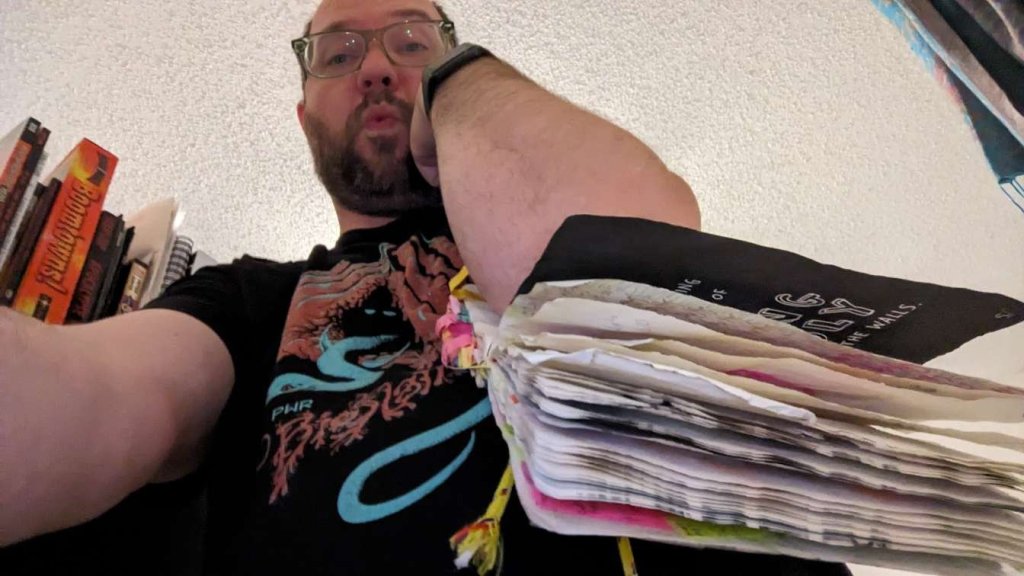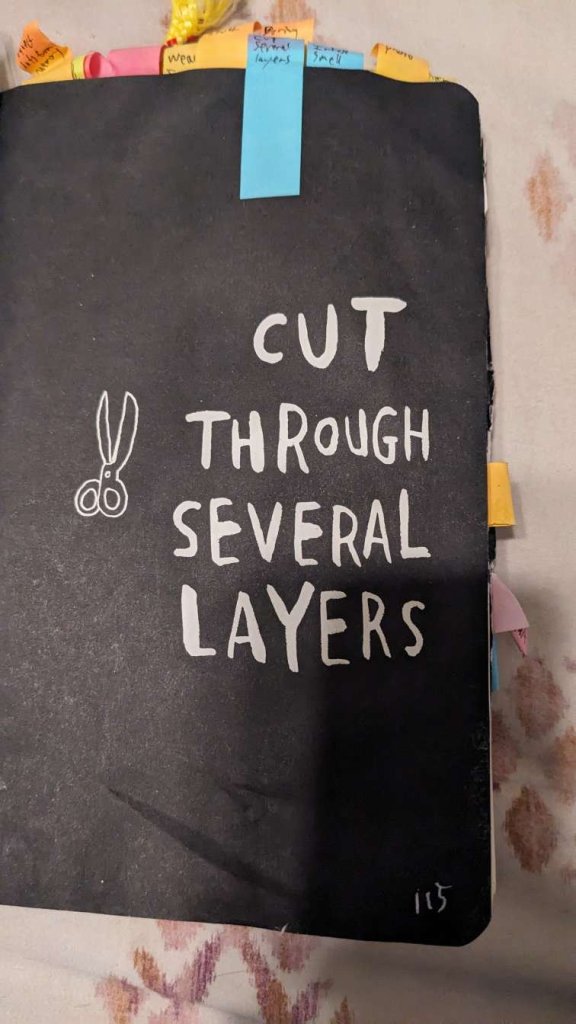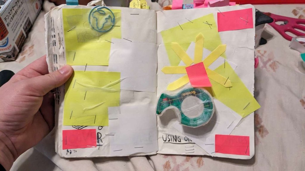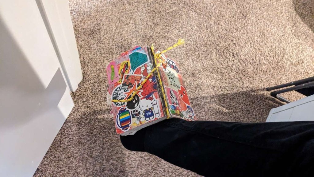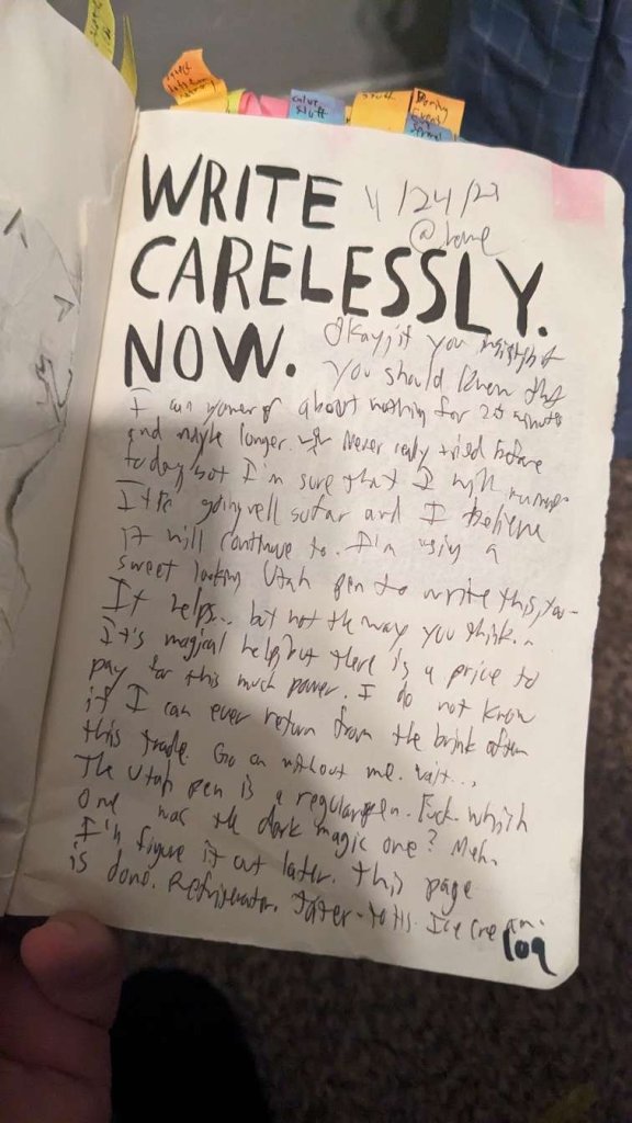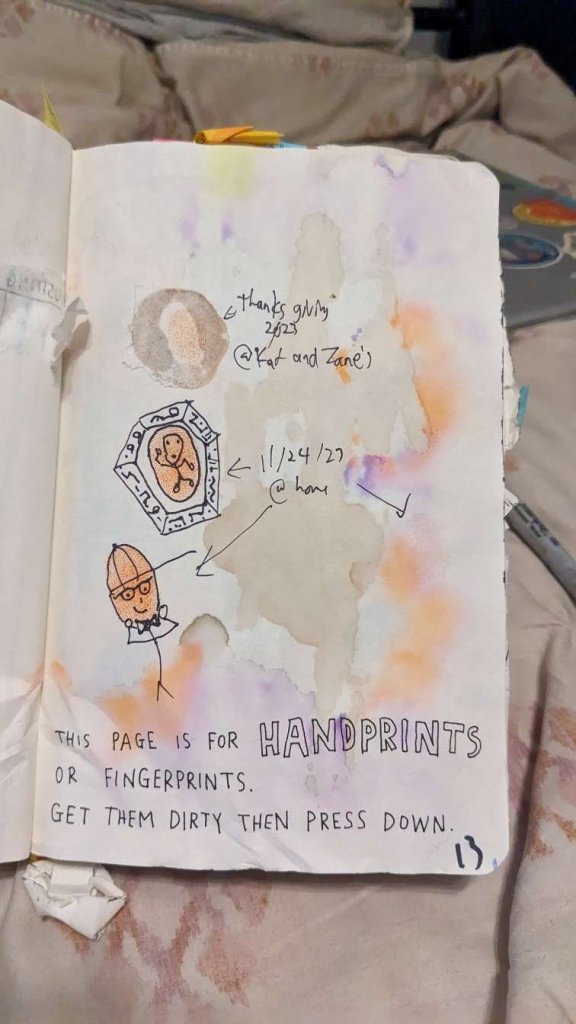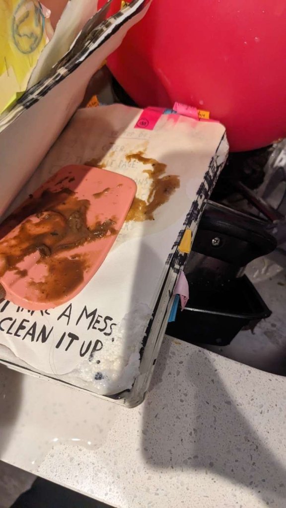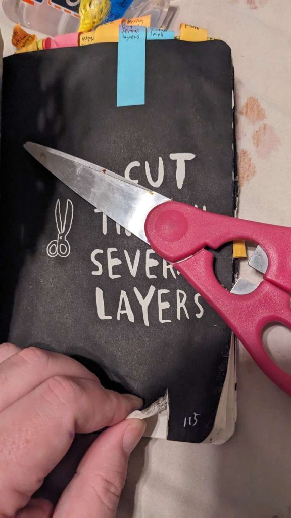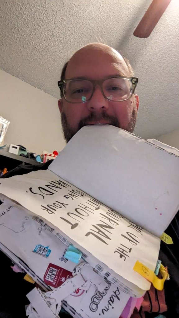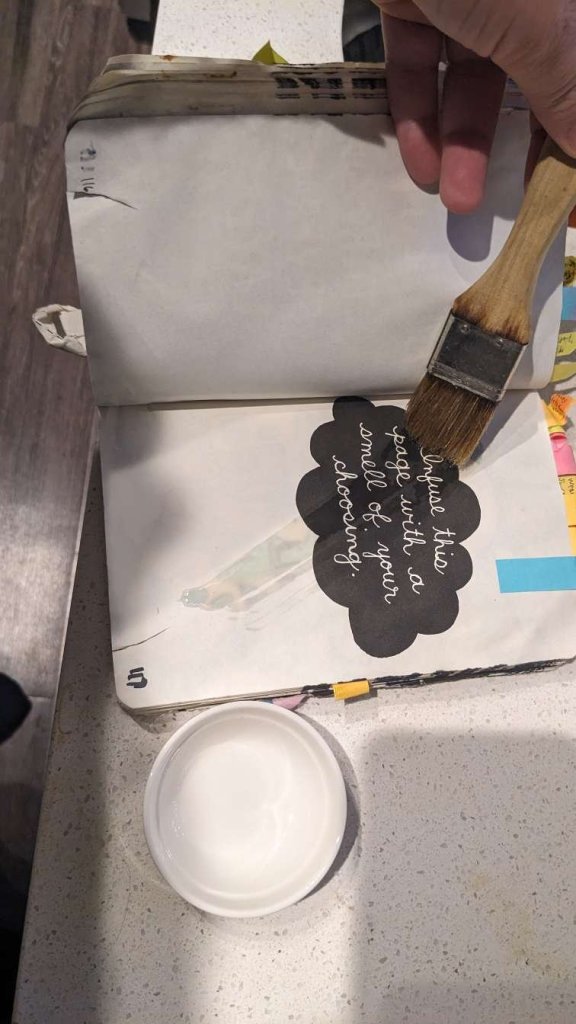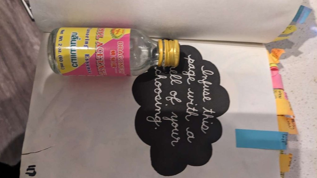 This copy of Wreck This Journal now sits open when laid down when paired with the office supply challenge that was also completed on this day.