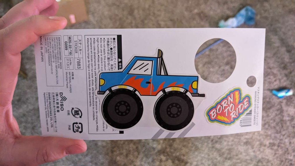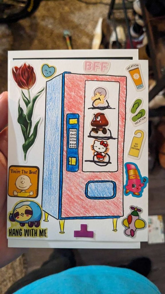 A postcard from a vending machine that Lauri colored and that I added stickers to.