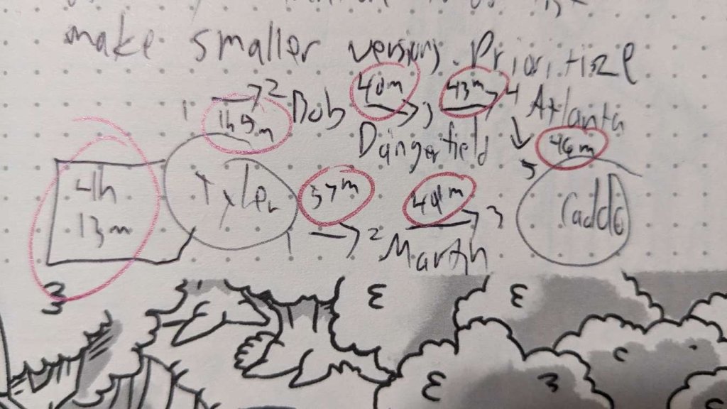 Here is a picture from one of the journals where I was mapping out driving times so that I could plan the best route and knew when to leave.