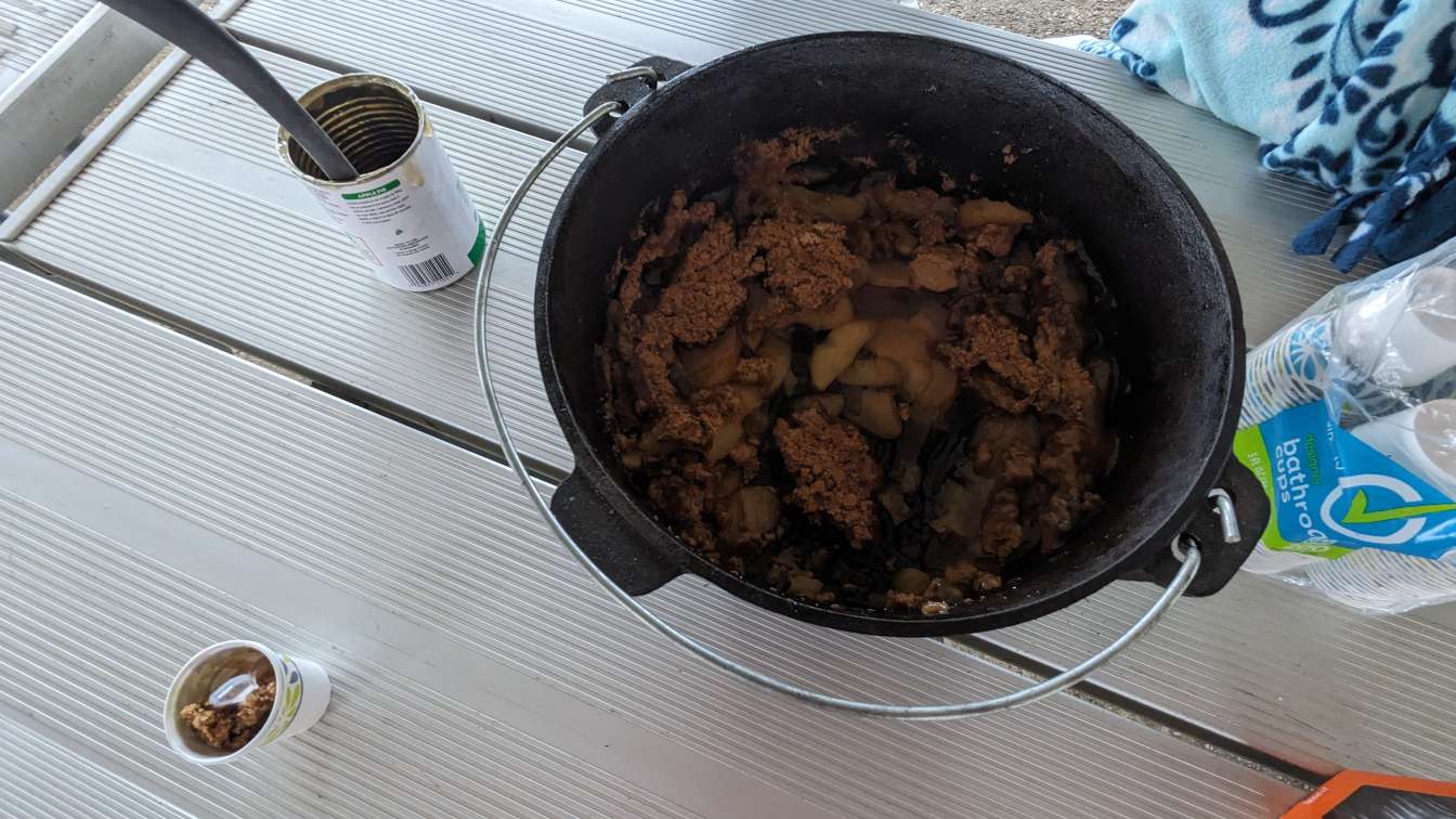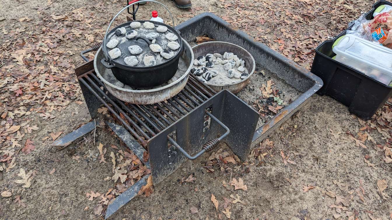 This method of cooking is meant to be completed with coal, a camp Dutch oven and two of these metal pans which can be purchased for less by purchasing them at a farmer store rather than a camping store (tips from the interpreter).