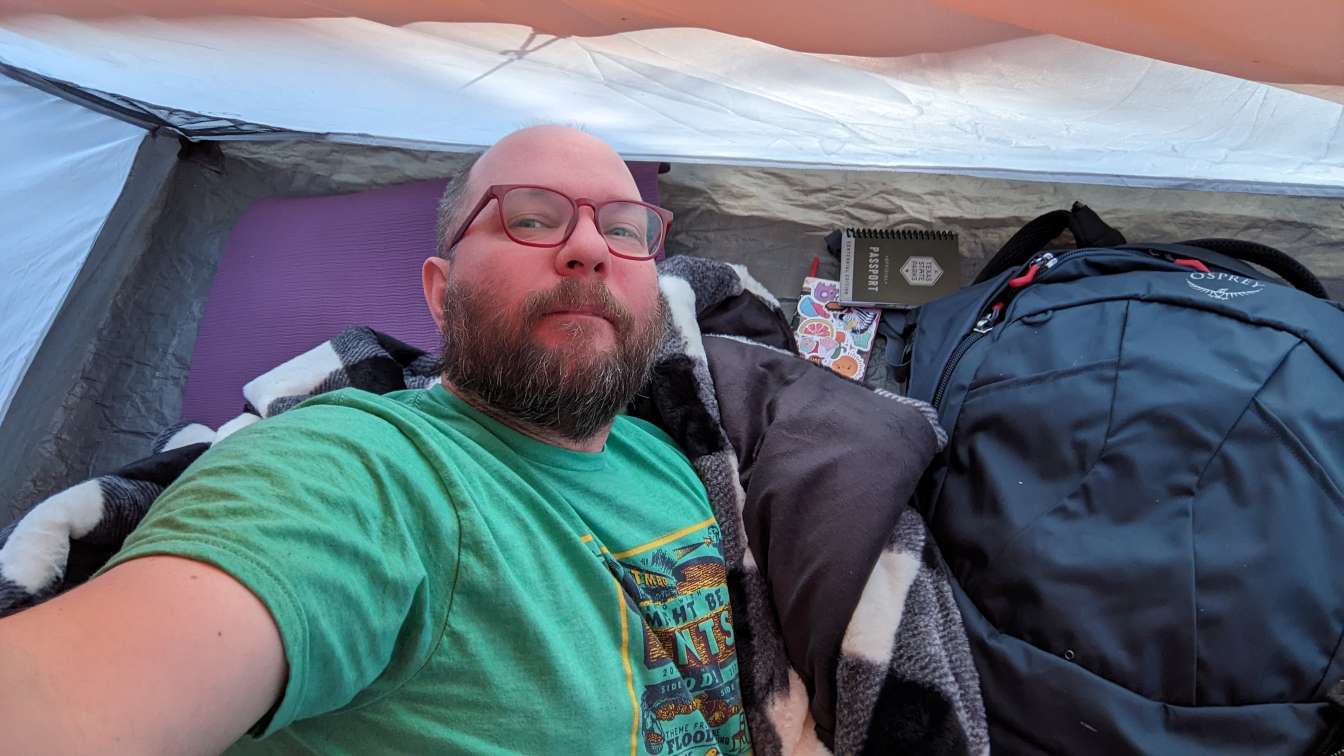 Some items to note in this picture: 1. That sticker covered book near my shoulder is my 2024 planner which is where my notes about the campsite Dutch oven were kept. The book on top of it is my Texas State Park passport book where I am gathering stamps of all of my park visits. The blanket I am laying on is one that I purchased from a Big Lots near my apartment since I do not own a sleeping bag. It cost me $35 and has been a popular addition to our household since this camping trip.