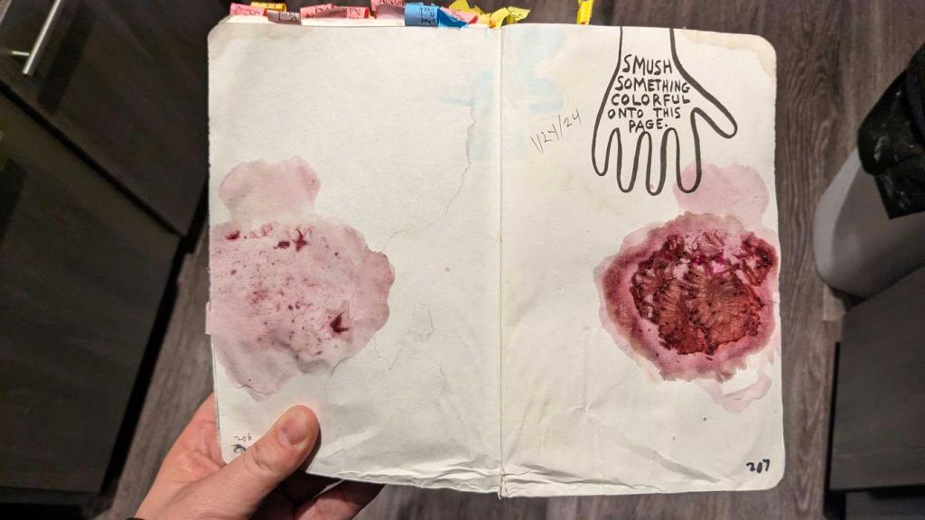 My strawberry smoosh from yesterday has dried out and the Wreck This Journal is another step closer to completion.