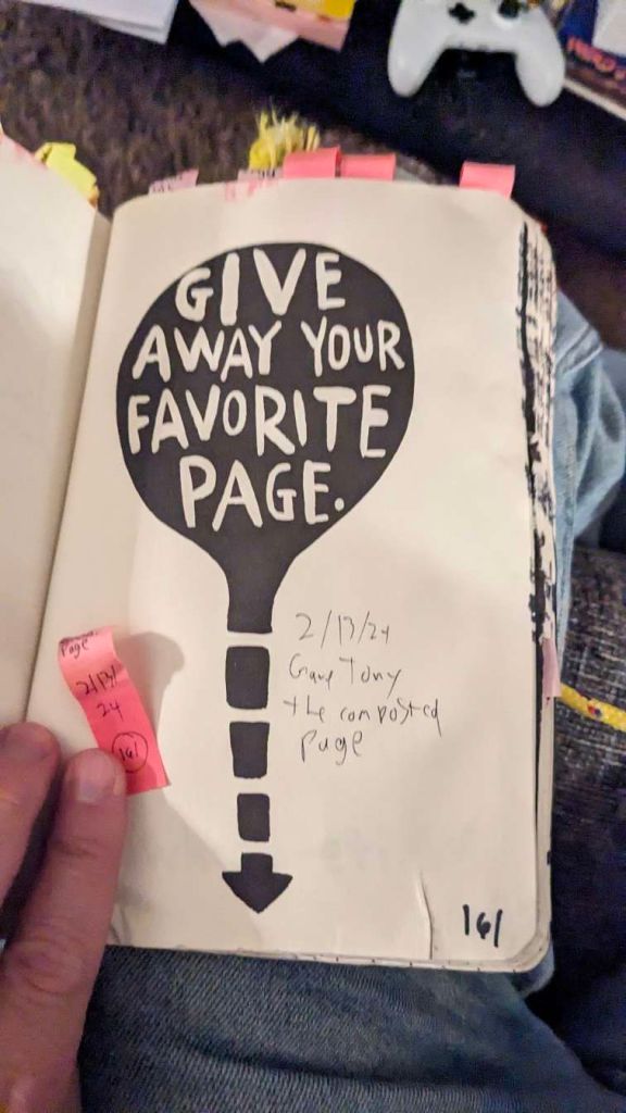 Tonight’s page told me to give away my favorite page and so I am mailing Tony, the recipient of much of my nonsense, my composted page.