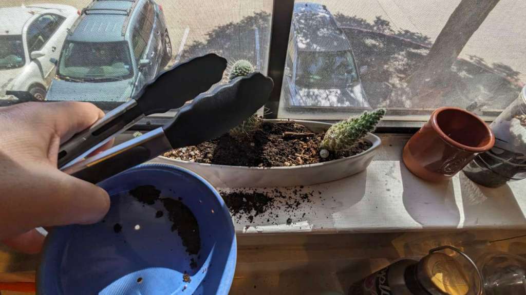 I moved the cat grass seeds to the Taco Bell cup and decided it was time to put the cactus in the window back into an upright position.