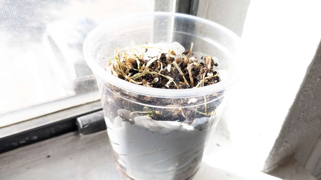 I moved the cat grass seeds to the Taco Bell cup and decided it was time to put the cactus in the window back into an upright position.