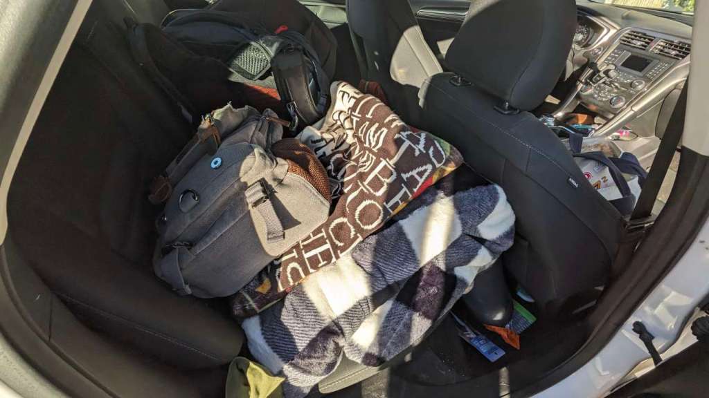 Clean the pots, pans & dishware. Put everything, especially food back into the car. Place sleeping and entertainment items into the tent. Set up the blankets and pillow.