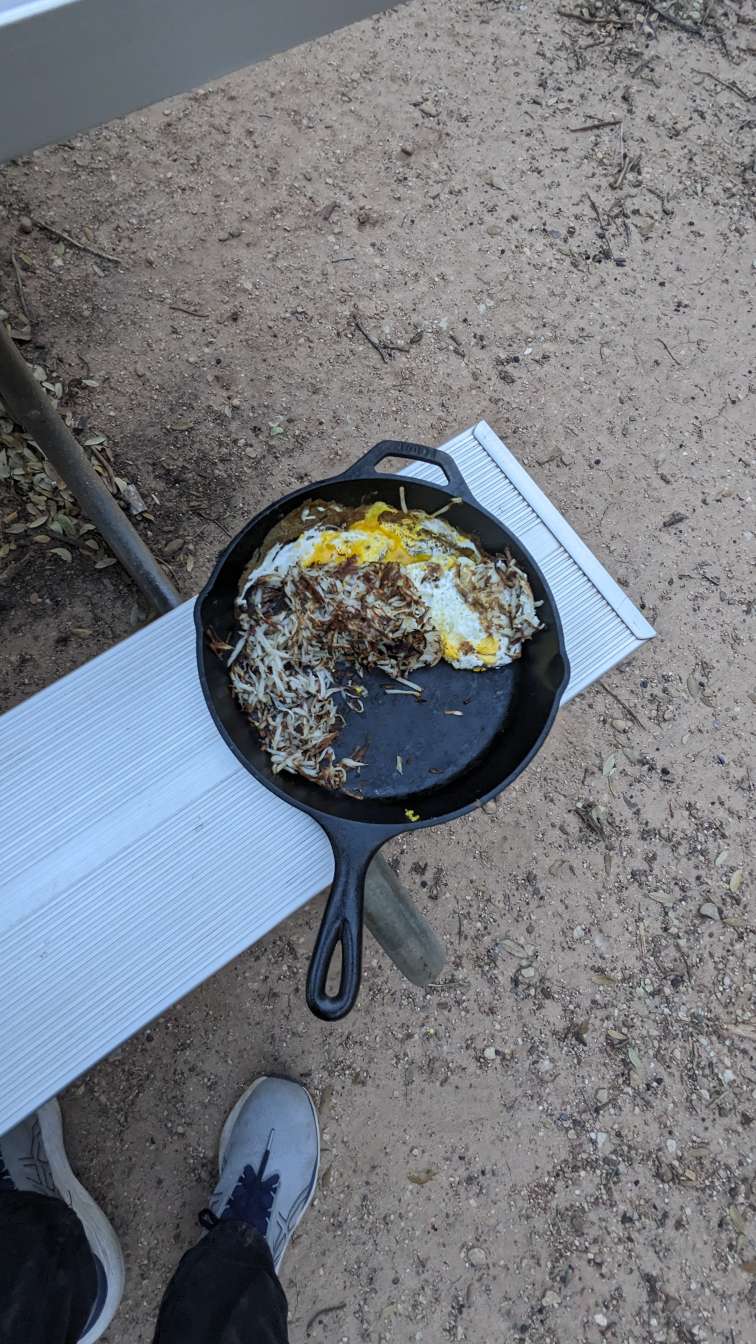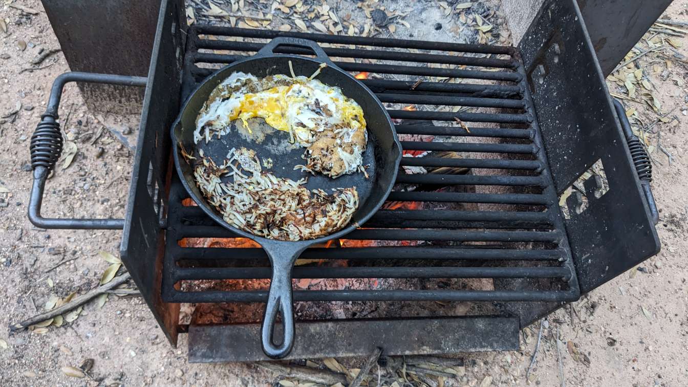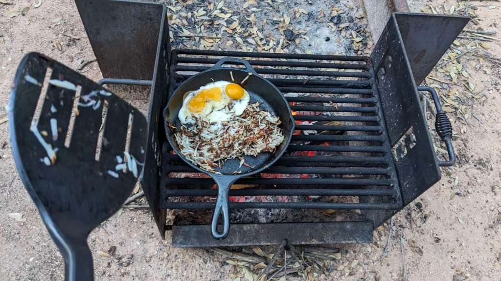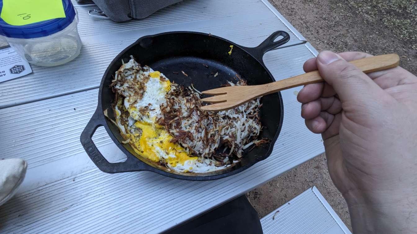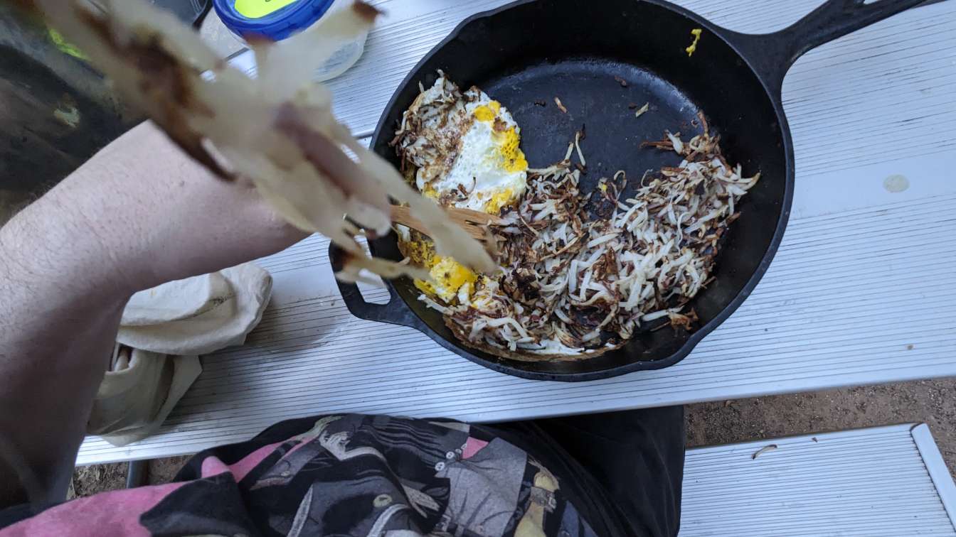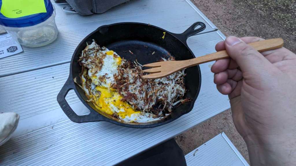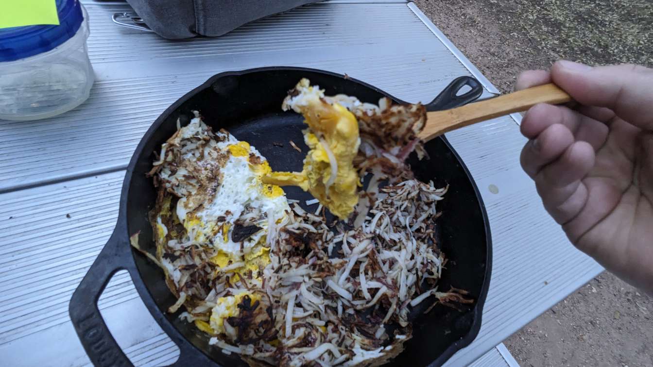 Hashbrowns are nearly complete, time to toss in a few eggs.