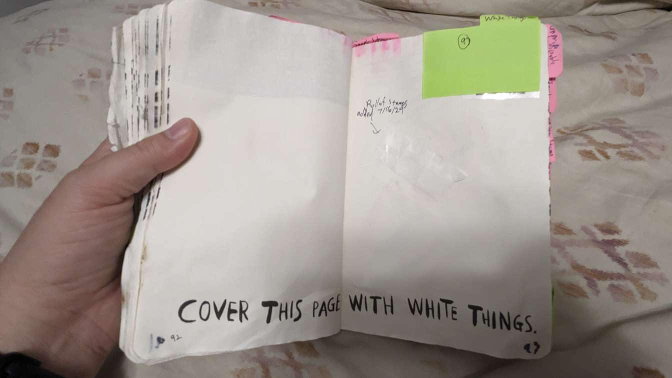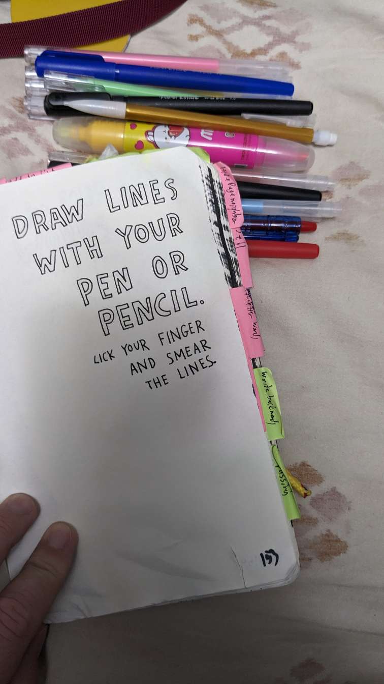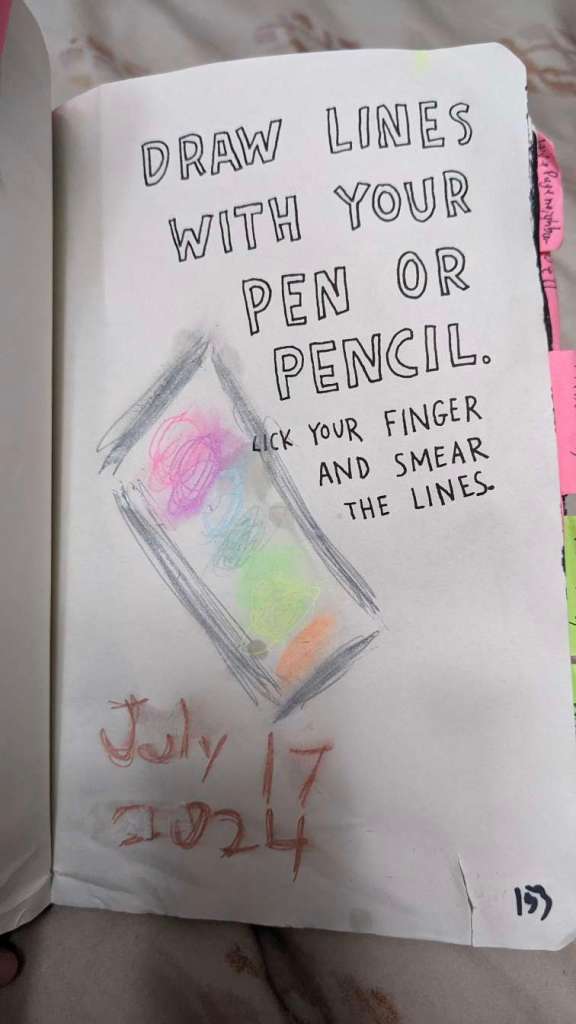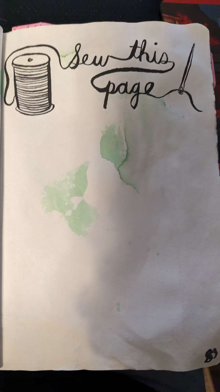 Several pages of Wreck This Journal are completed in stages, for example today I added a “white thing” to this page.