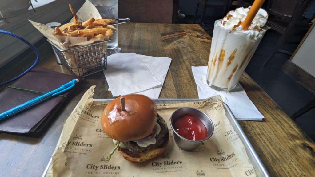 It was hard to get up again, but I did and I went and had a nice burger and a couple of drinks at the hotel’s bar and restaurant.