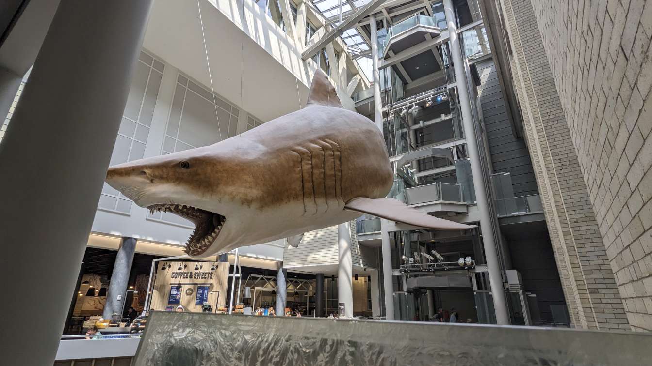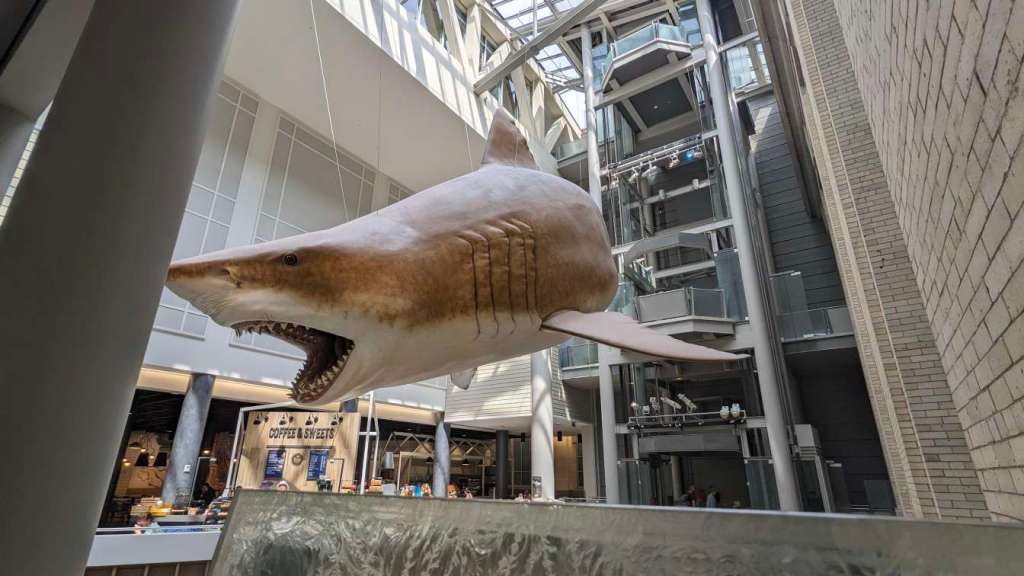 Giant shark above the cafeteria.