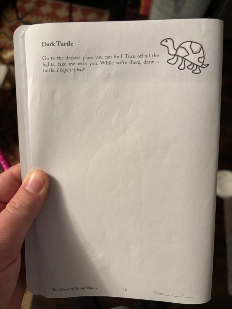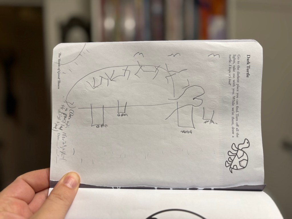I would like to share one page from this book that I have completed: Draw a turtle in the dark.