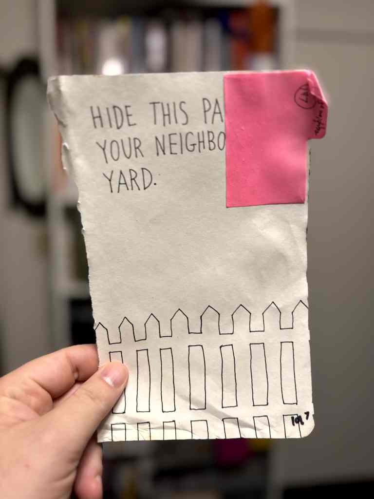 A page of Wreck This Journal that has been haunting me is the “hide this page in your neighbor’s yard” one.