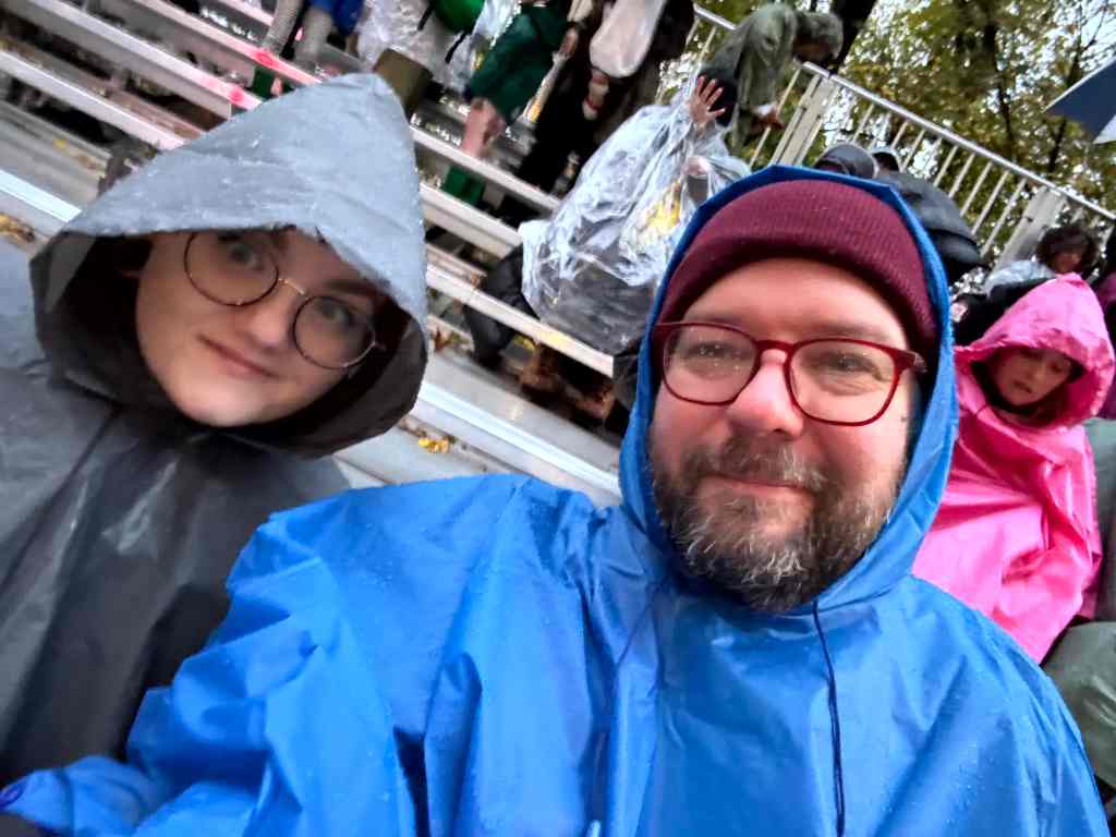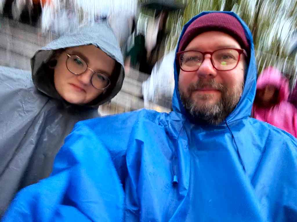We stand here for a long time. Long after the time listed on our tickets says we’ll be allowed entry, but we get make it in and our ponchos are doing their job.