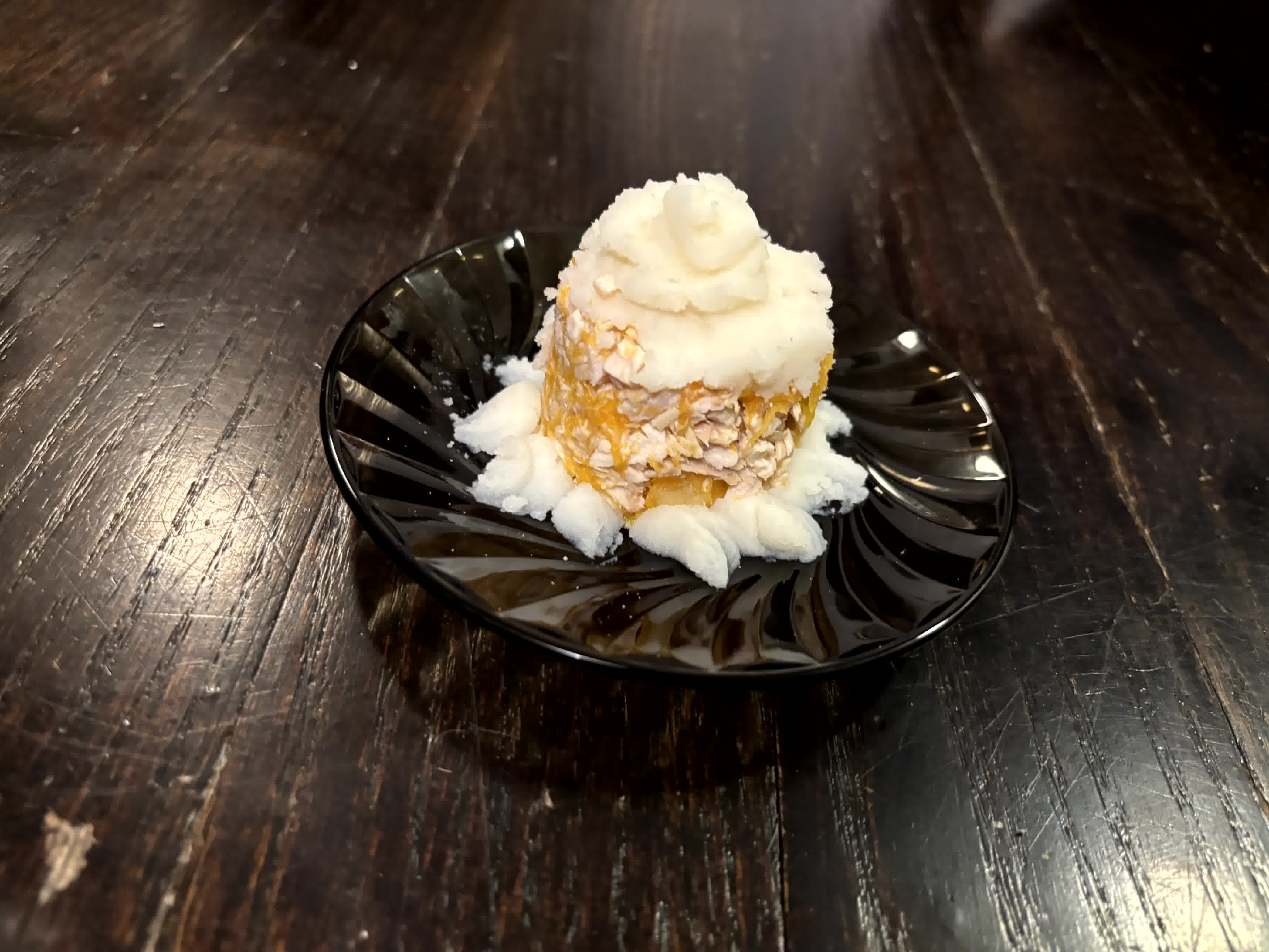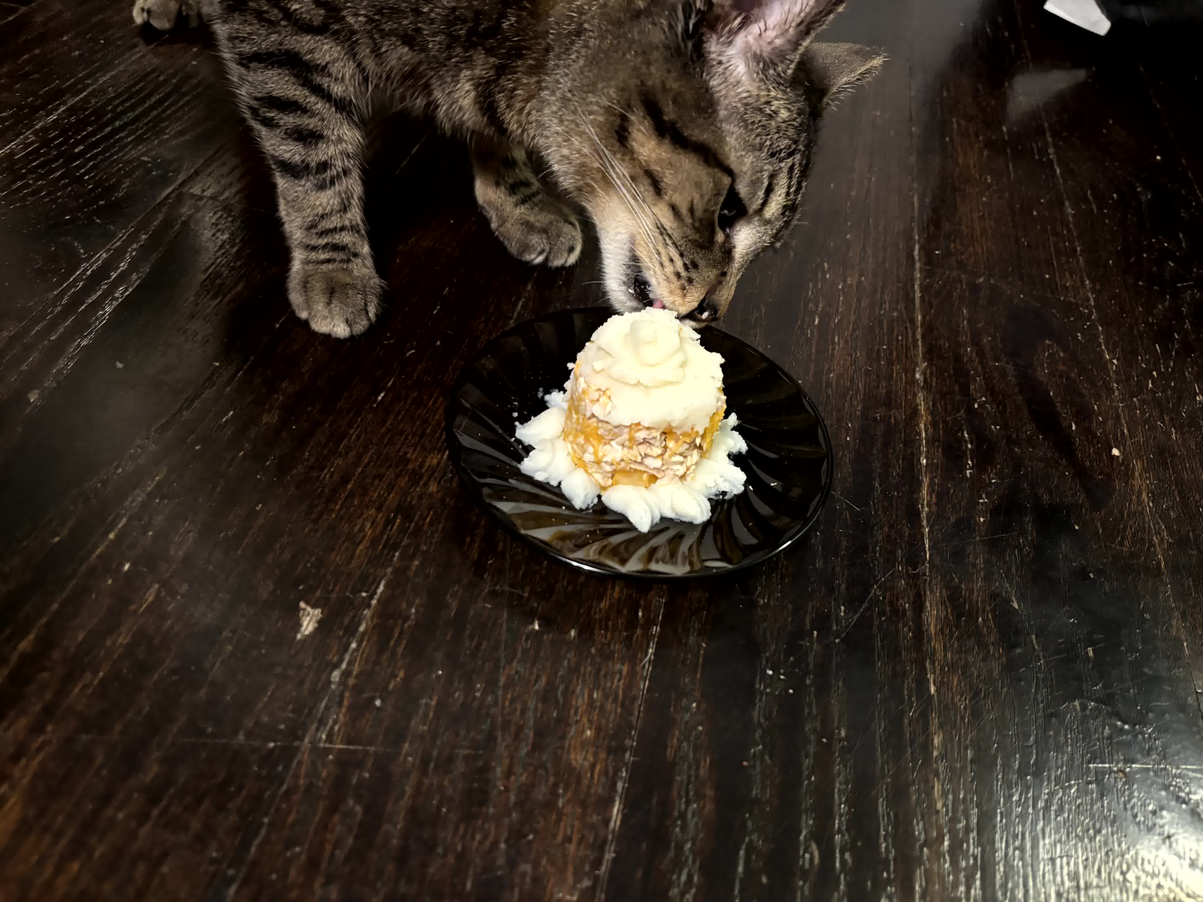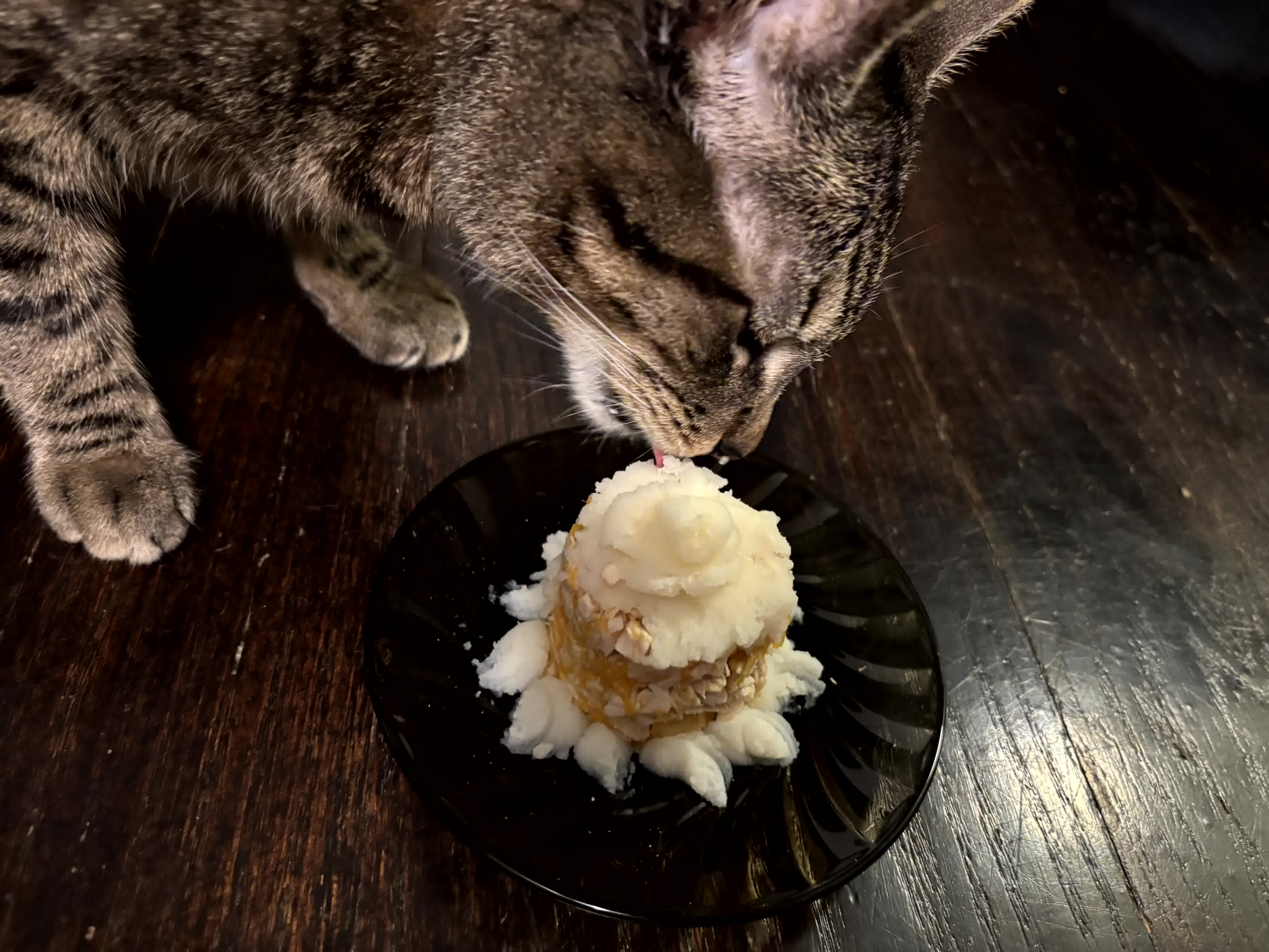 Our cat Penny who had FIP is now fully cured and so we celebrated this evening with a cat cake which is tuna and mashed potatoes.