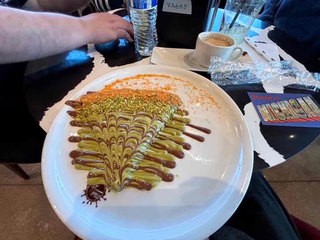 I received a sweet pistachio crepe with fondue and drizzle.