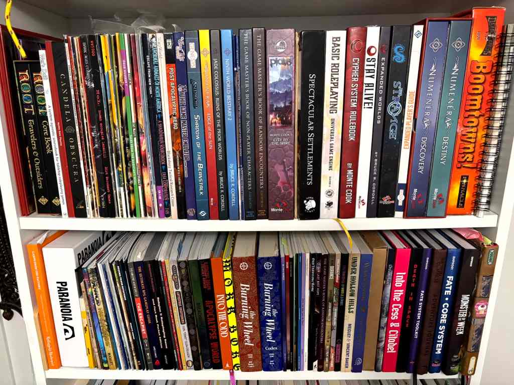 I did not take any pictures of Hex & Co. where we met to play games, but here’s a picture of my pen and paper RPGs.
