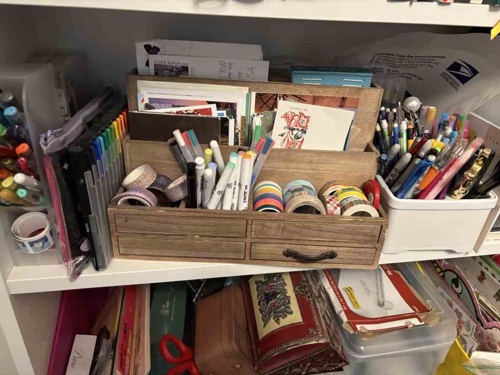 The wooden… “thing” with postcards, washi tape and my secondary-pens.