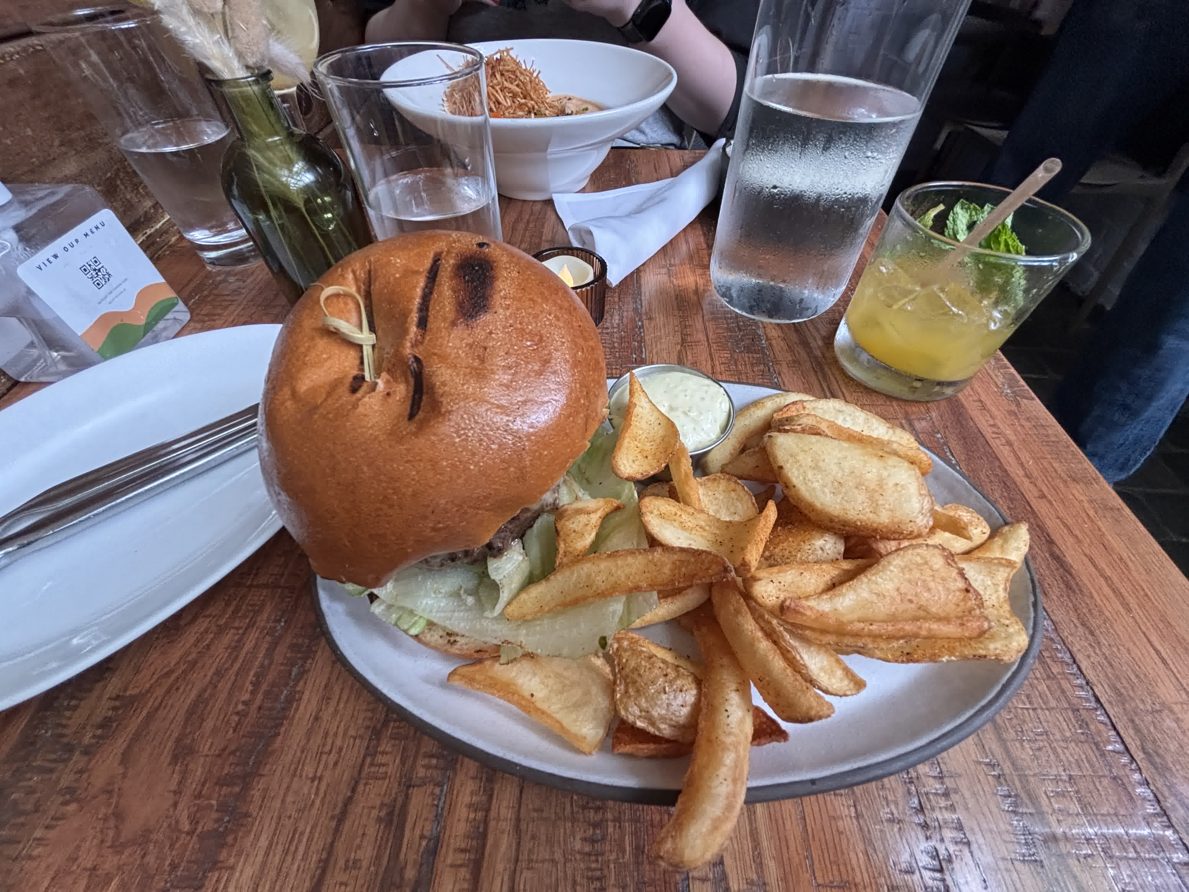 I ask our wonderful server Dino (who is wearing a Dino dinosaur toy) what he suggests, and this earns me an amazing burger.