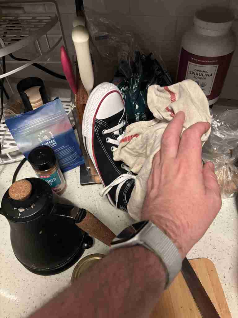 Lauri definitely put one of her shoes on the kitchen counters standing upright and accidentally covered it with a dish towel.