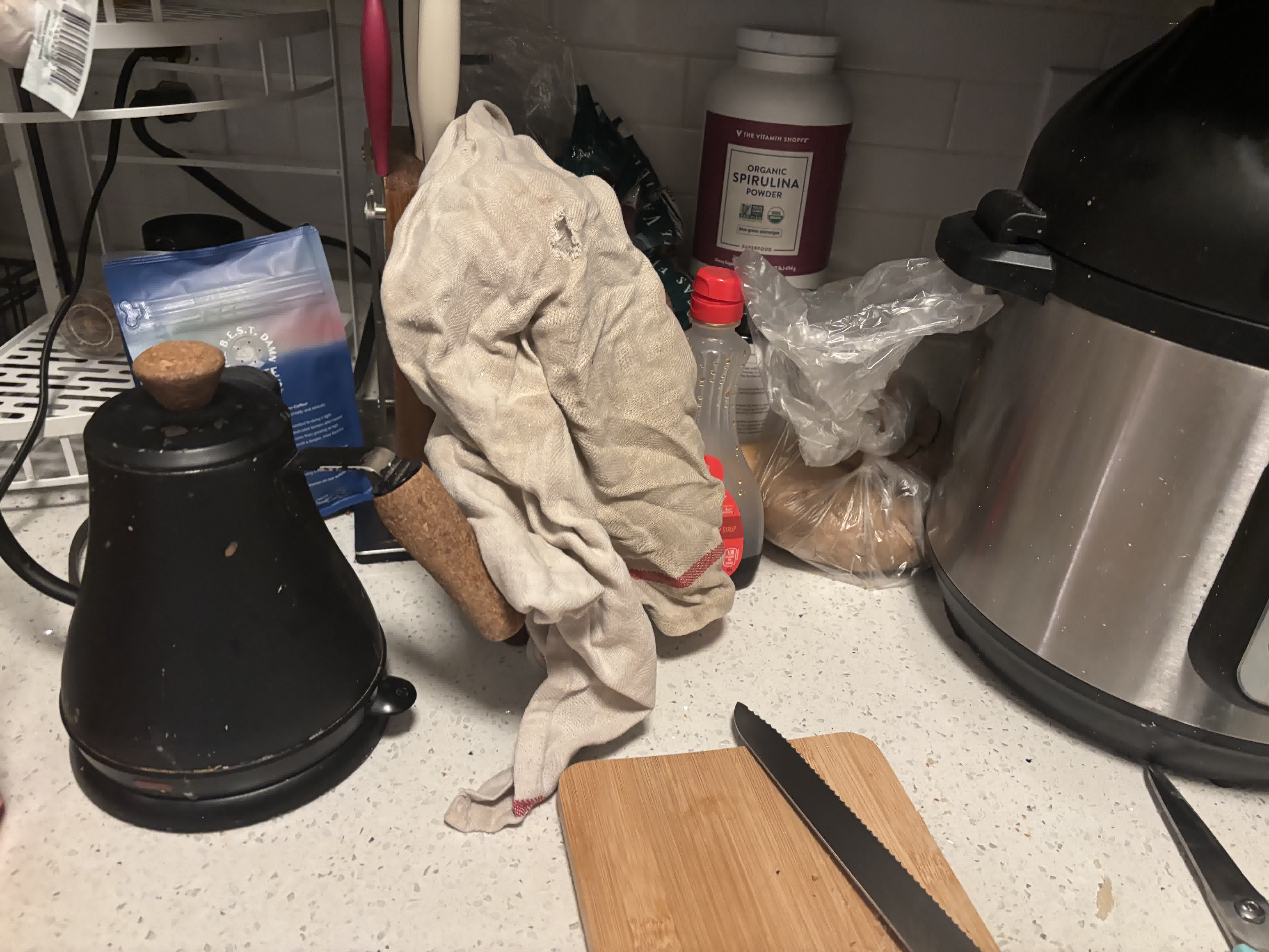 Lauri definitely put one of her shoes on the kitchen counters standing upright and accidentally covered it with a dish towel.