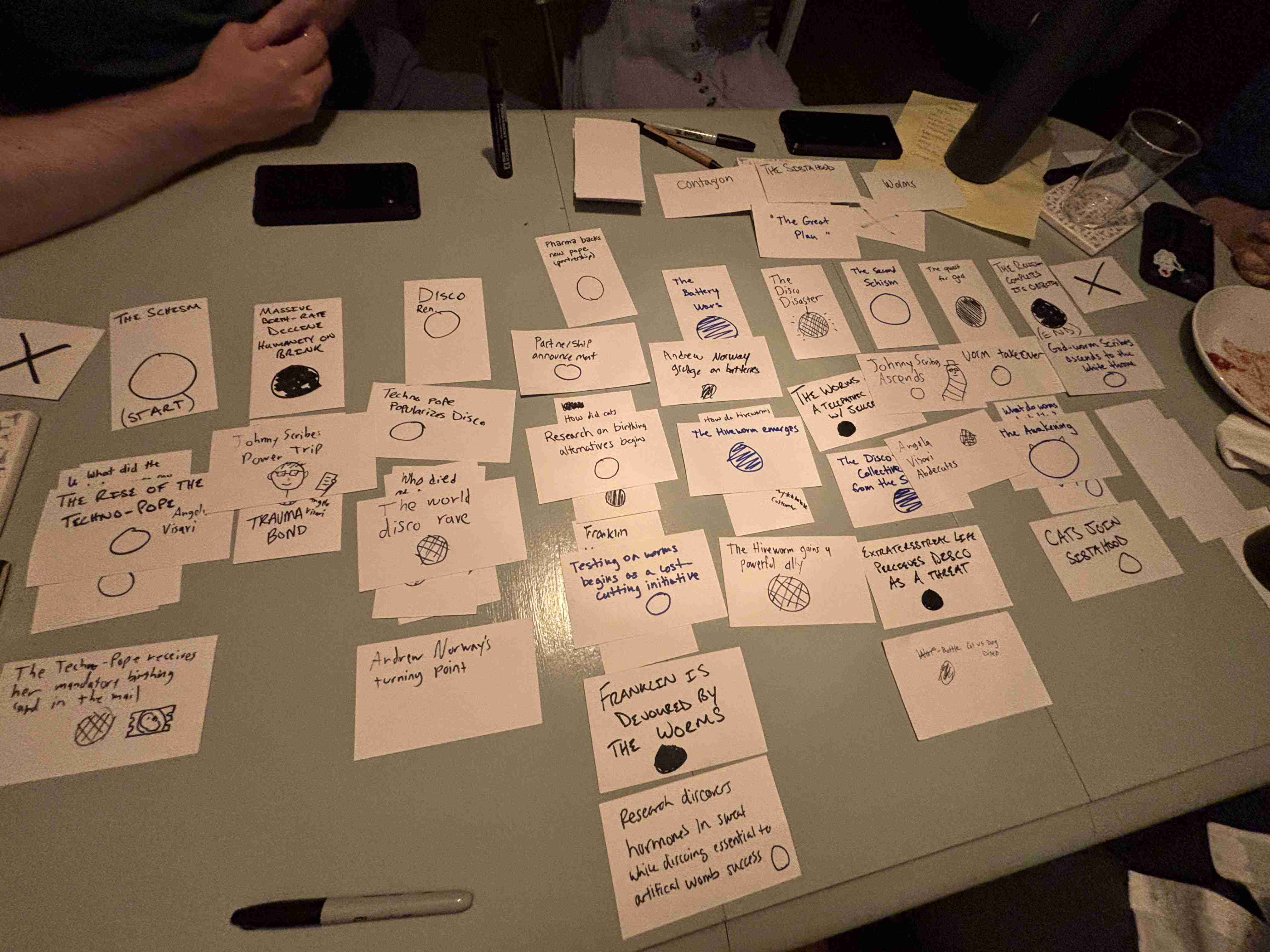 Players take turns adding new pieces of information to a society until the history is filled in from beginning to end.