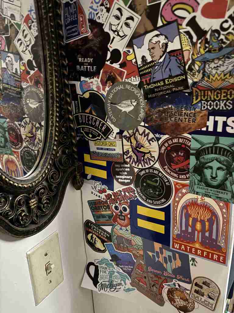 I keep a wall of stickers on paper on the side of my bookshelf, by the way.