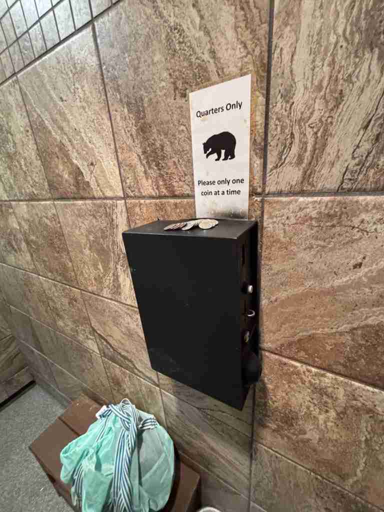 I discovered this flaw as I inserted my final quarter into the machine which caused the shower to instantly turn on, full blast and pointed at the end of the bench where the blue bag with my dirty clothes are sitting.