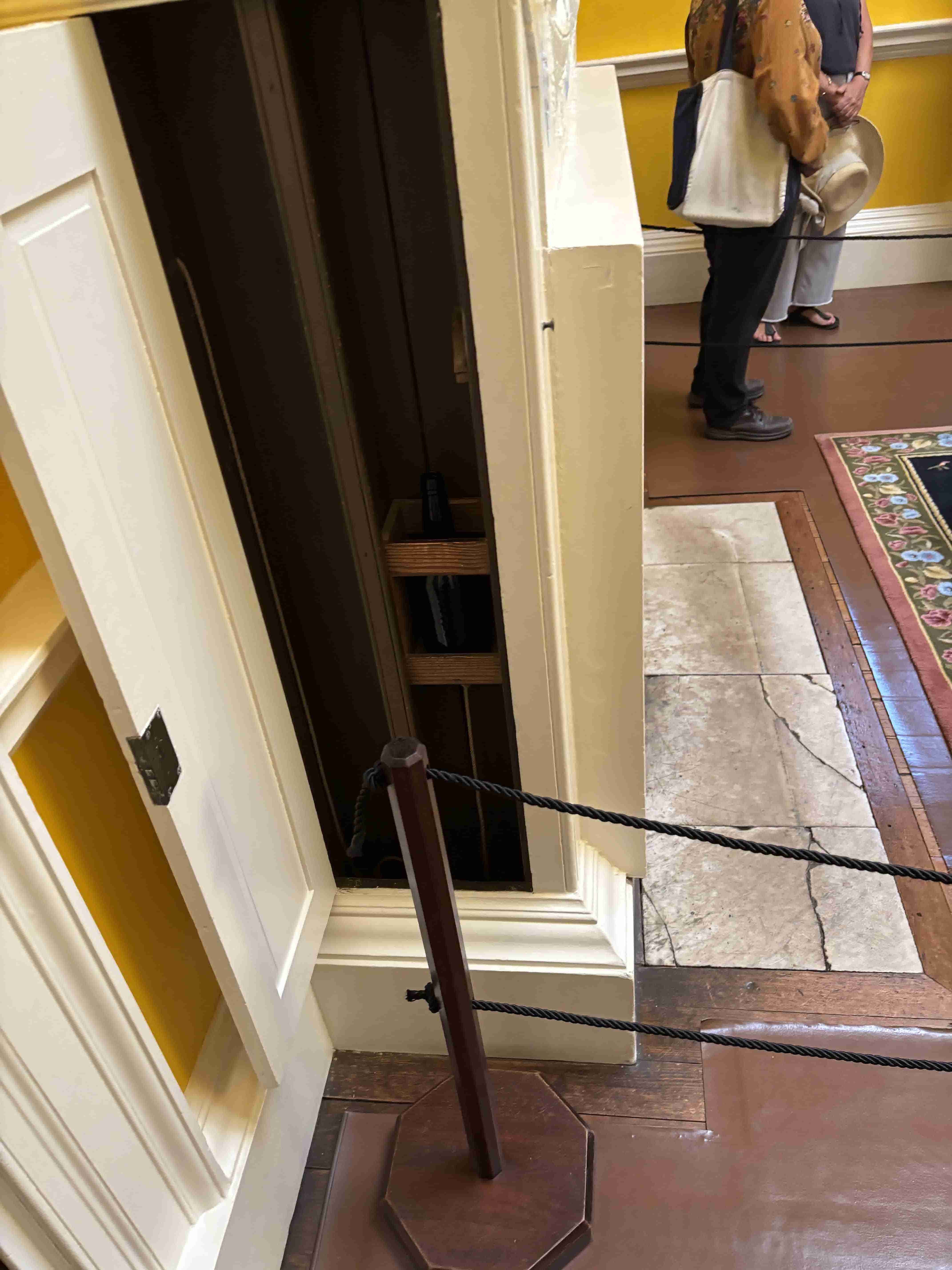 Check out this dumbwaiter built into the side of the fireplace to bring wine up from the cellar.