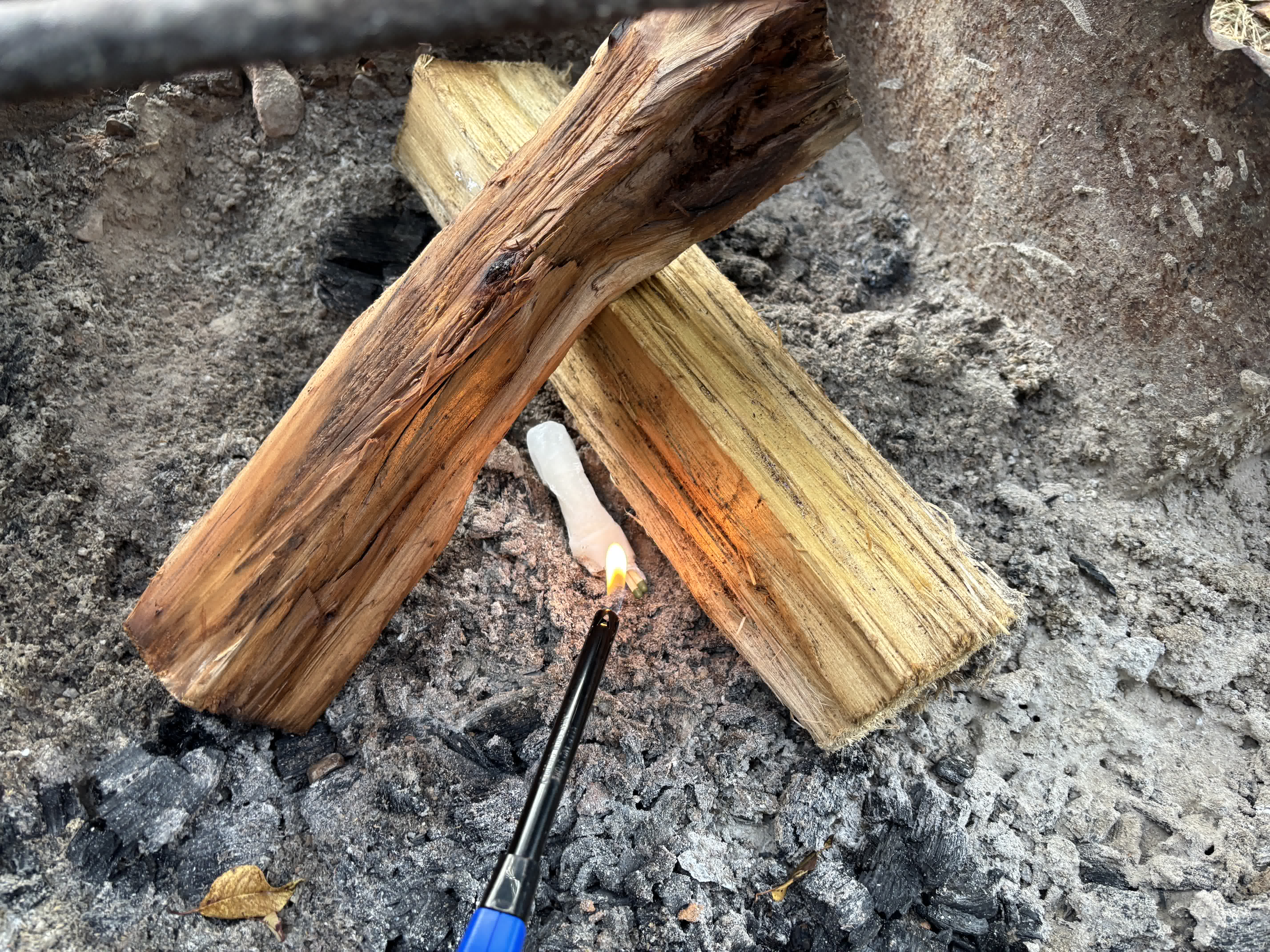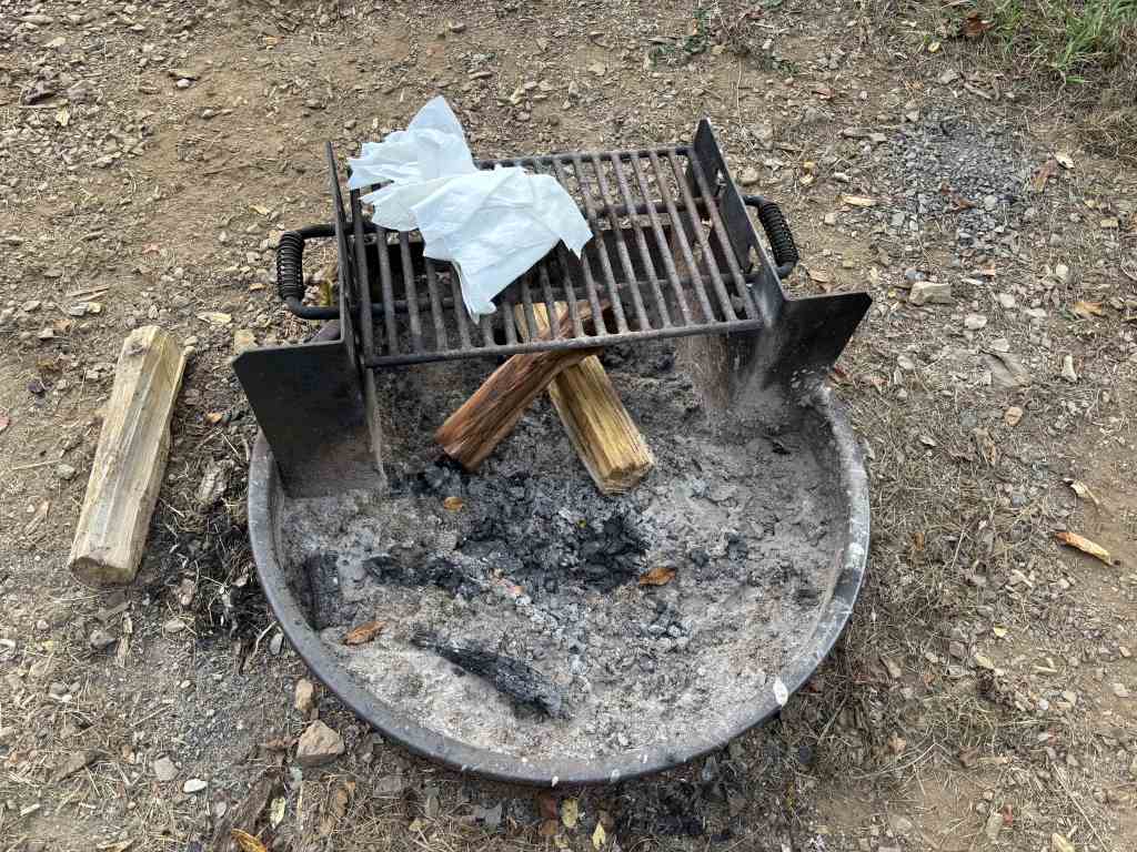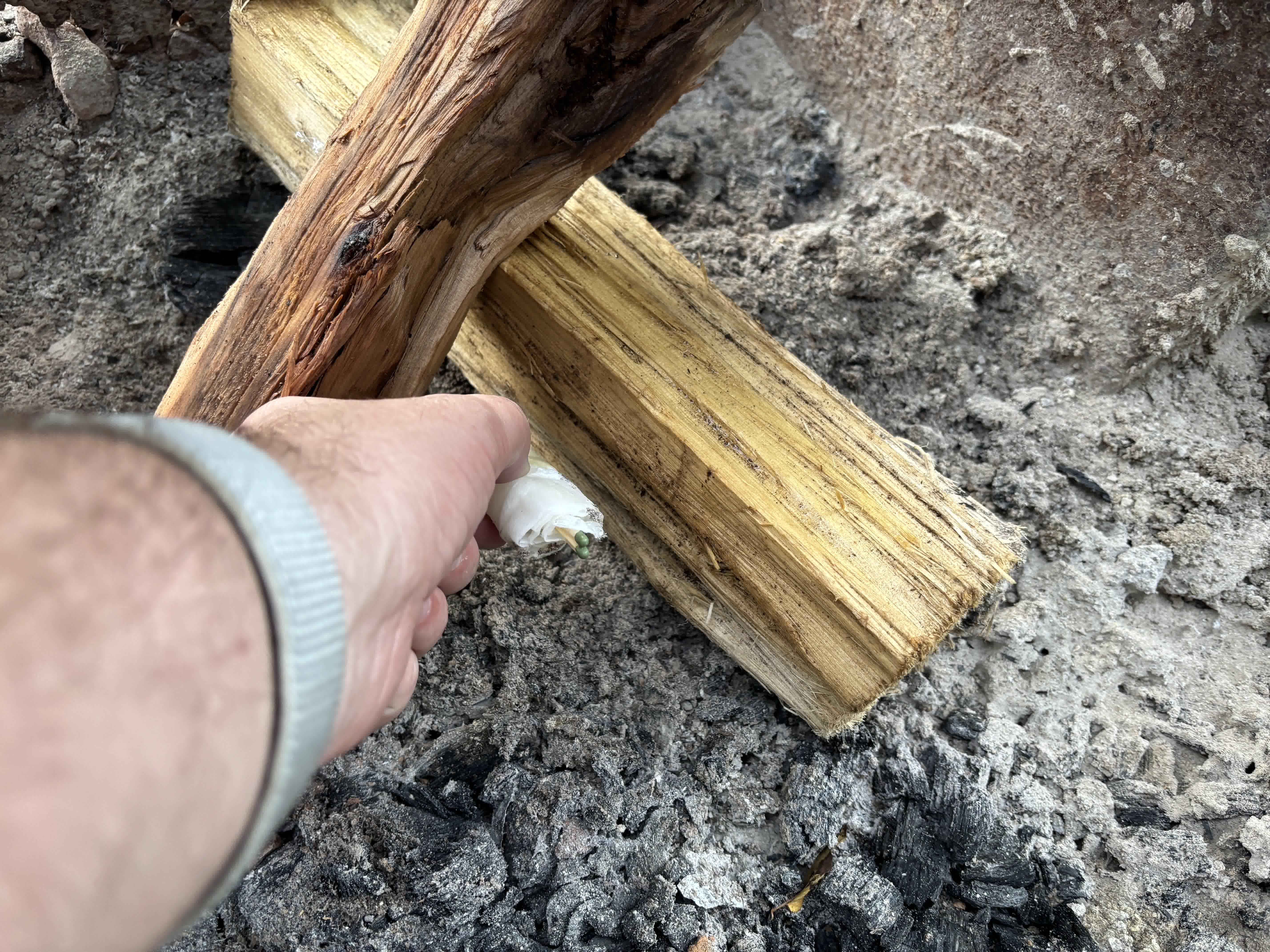 I’ll soak them with charcoal starter and place one of the fire starters below them.