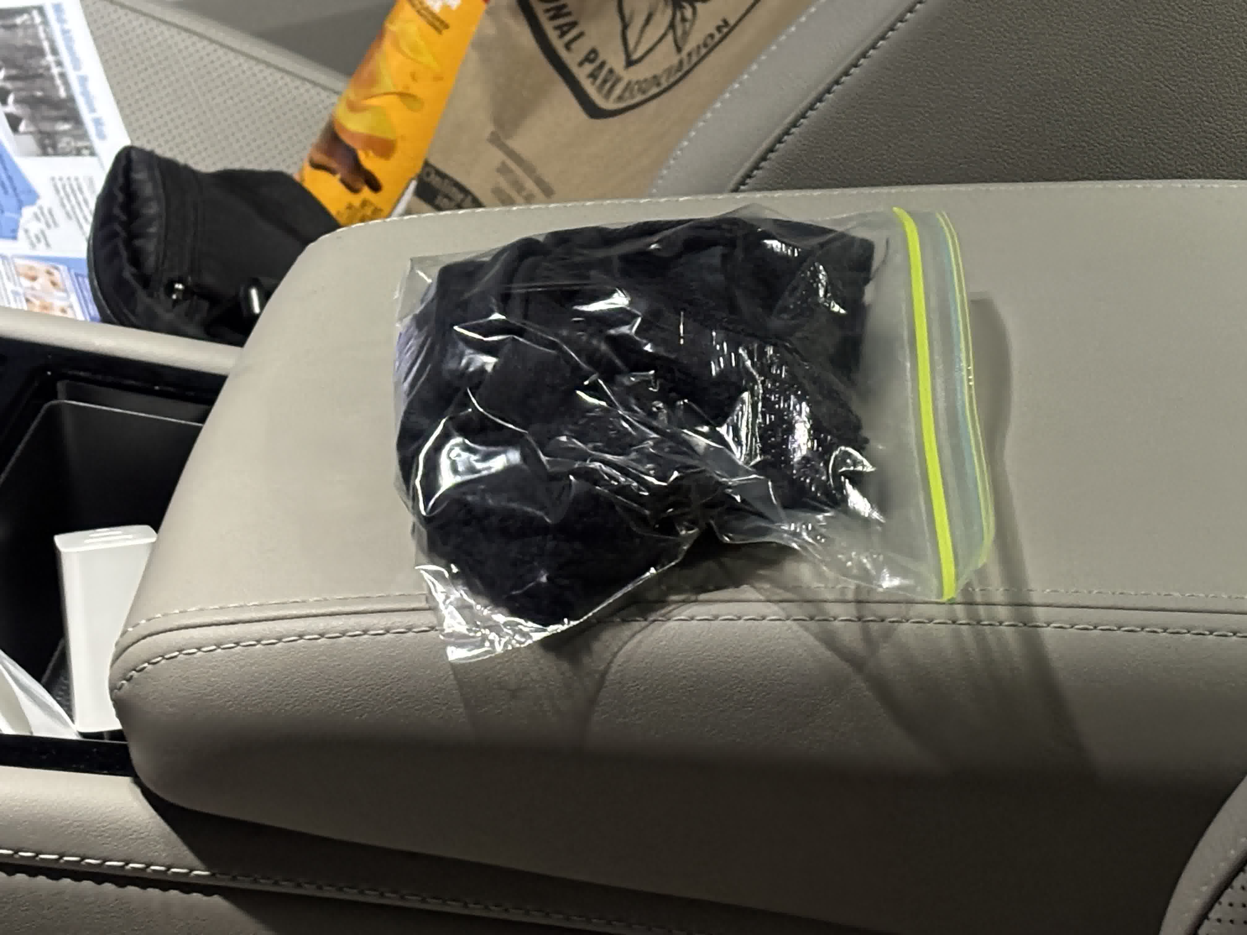It’s scented so it needs to stay in the car as well, but I don’t want to get a wet funk going on in there, so I’ll stick it in a resealable plastic bag.
