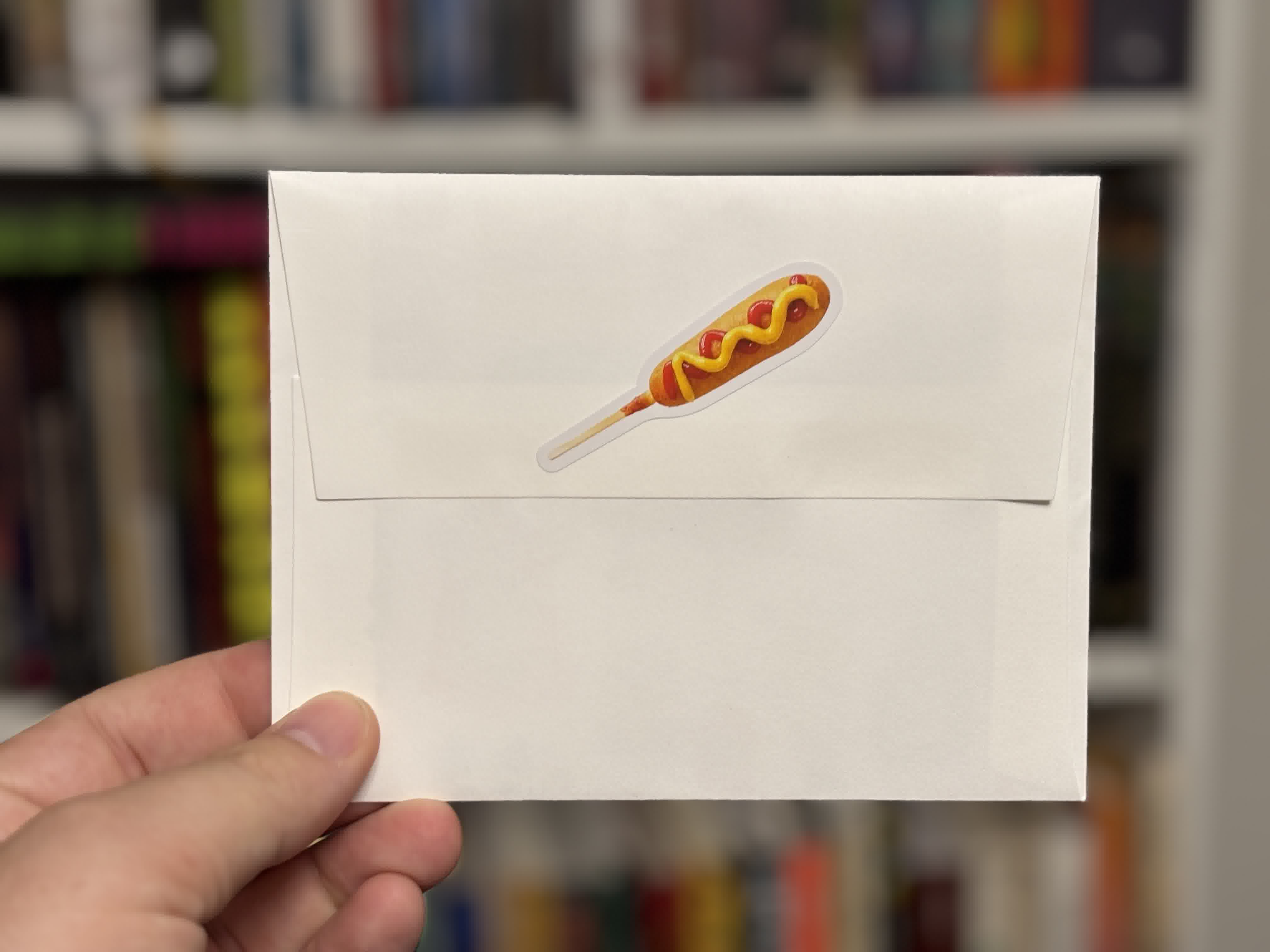 Please accept this picture from the back of the envelope with a corn dog sticker as a replacement.