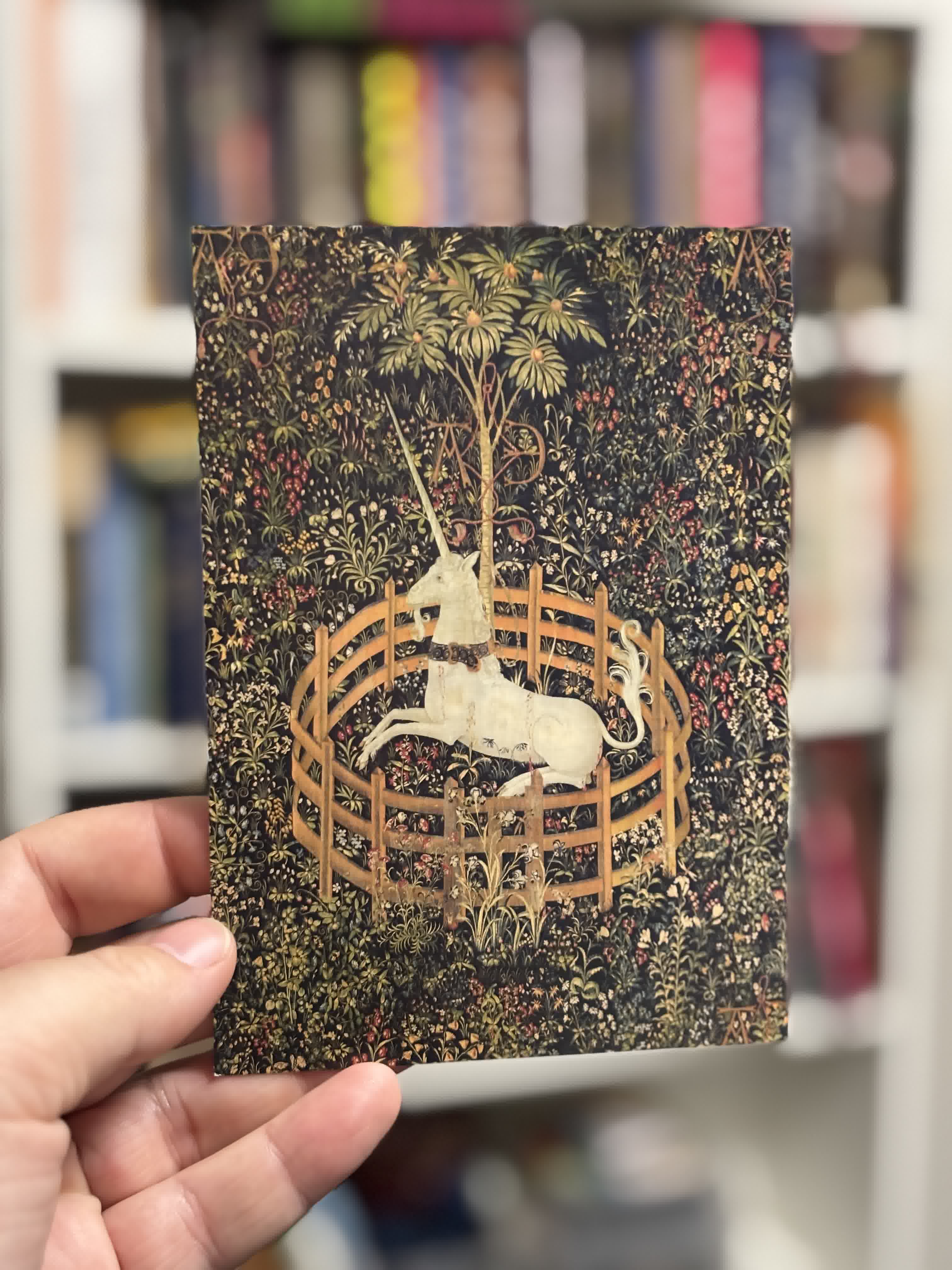 The next postcard is going to Israel and is a postcard of the unicorn tapestry at The Met.
