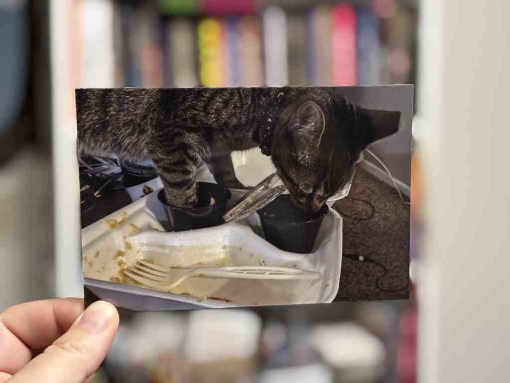 It is a postcard of our cat Penny being naughty. I share some of her stories of naughtiness and that she is a FIP survivor on this card.