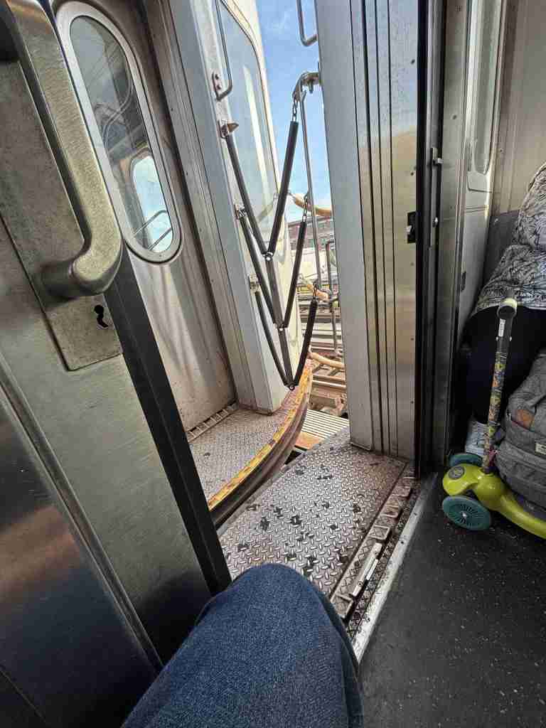 We wait for the family across from us so that we can hold open the car doors as they have a stroller to get through.