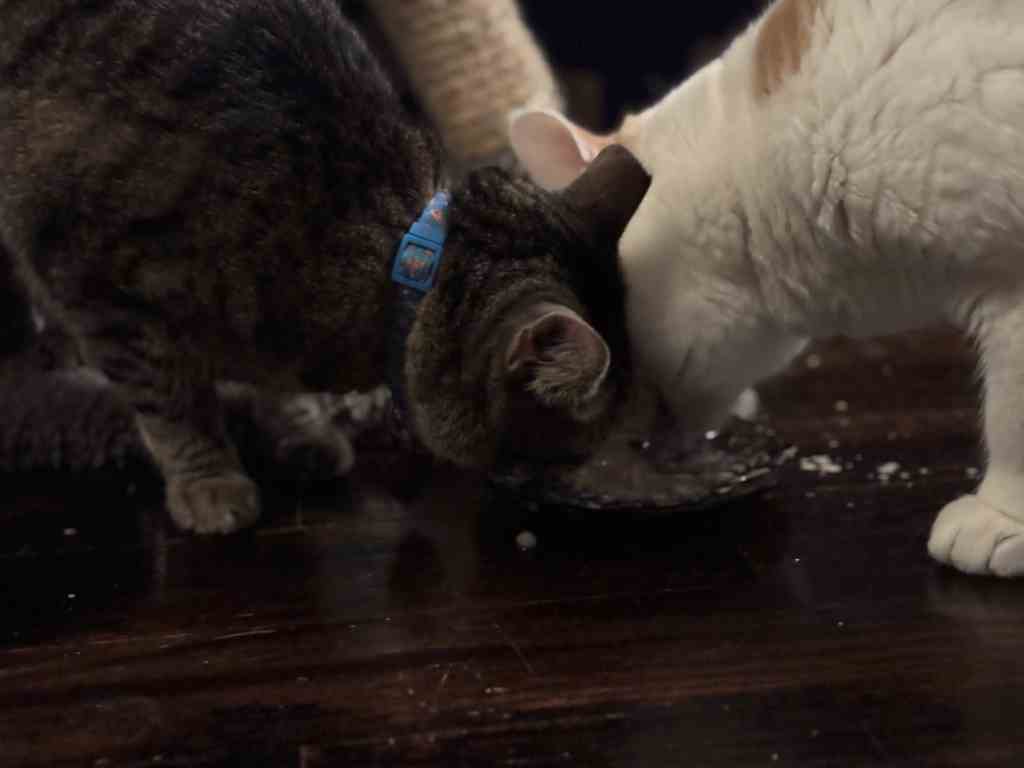 Speaking of a nice meal, once per day our three cats get wet food, and today for some reason Penny and Remus decided to eat wet food from the same dish. I have never seen this before or after this incident.