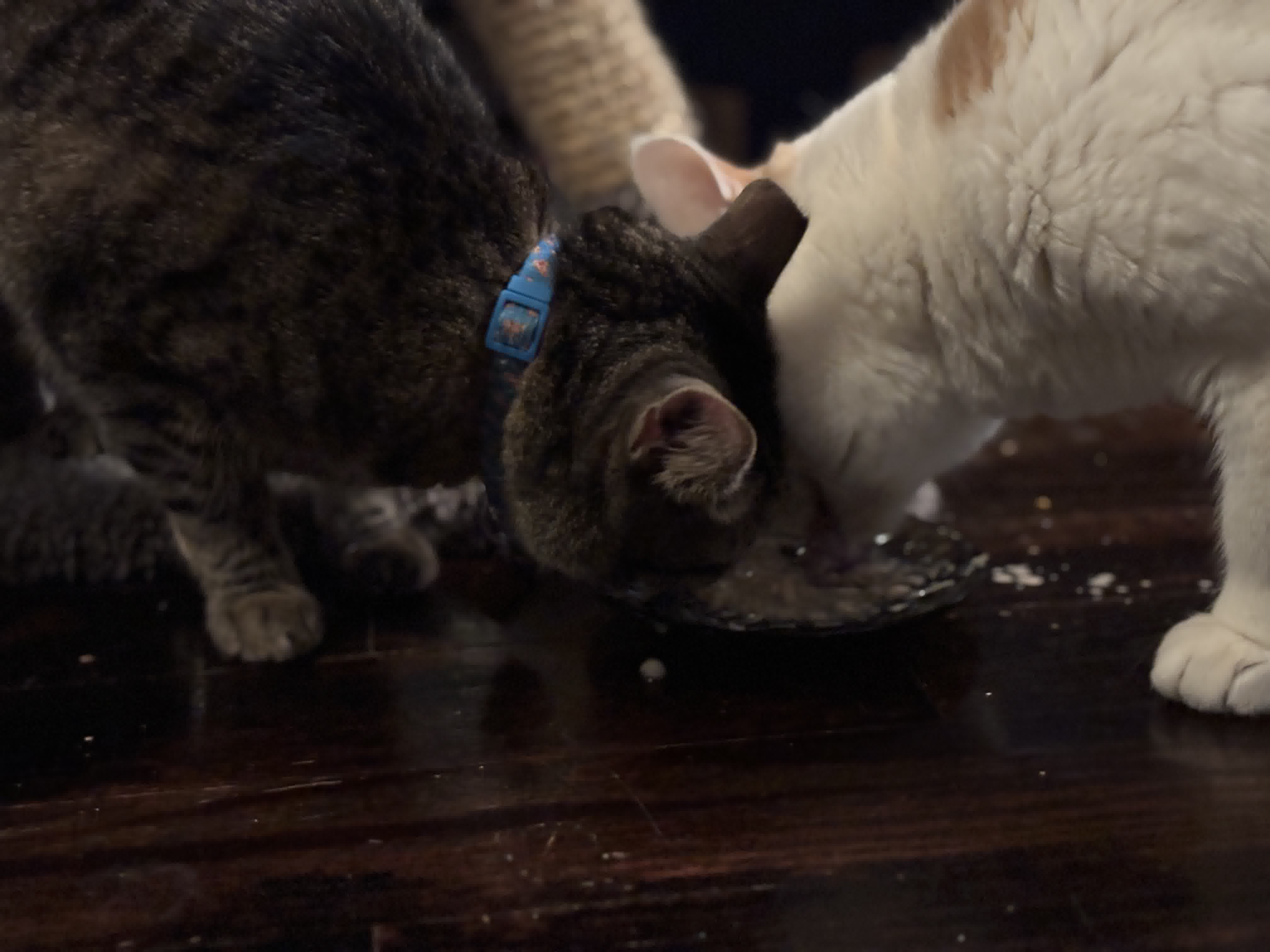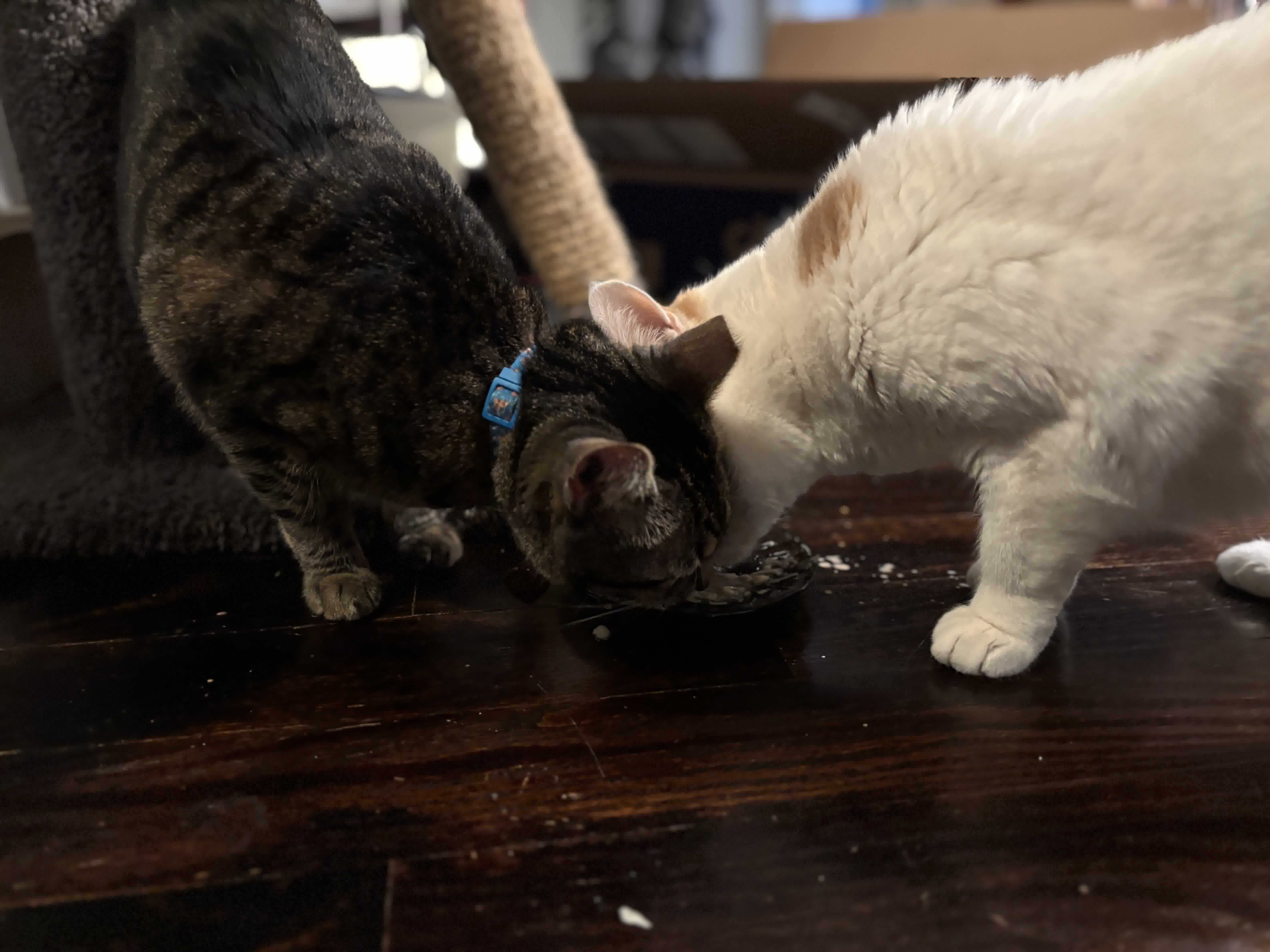 Speaking of a nice meal, once per day our three cats get wet food, and today for some reason Penny and Remus decided to eat wet food from the same dish. I have never seen this before or after this incident.