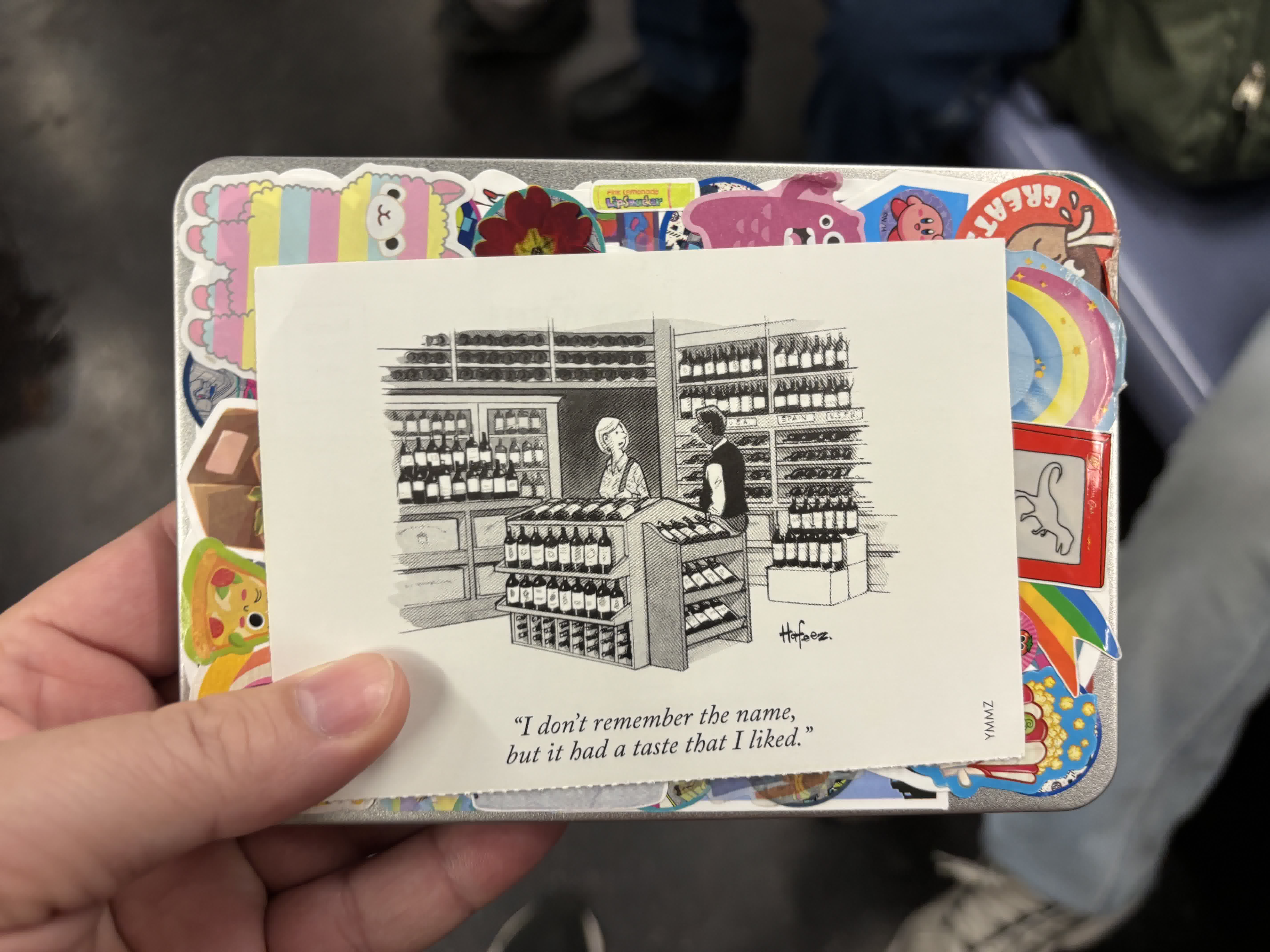 Under the postcard is the tin that I use to carry my stamps and postcards when I go out.
