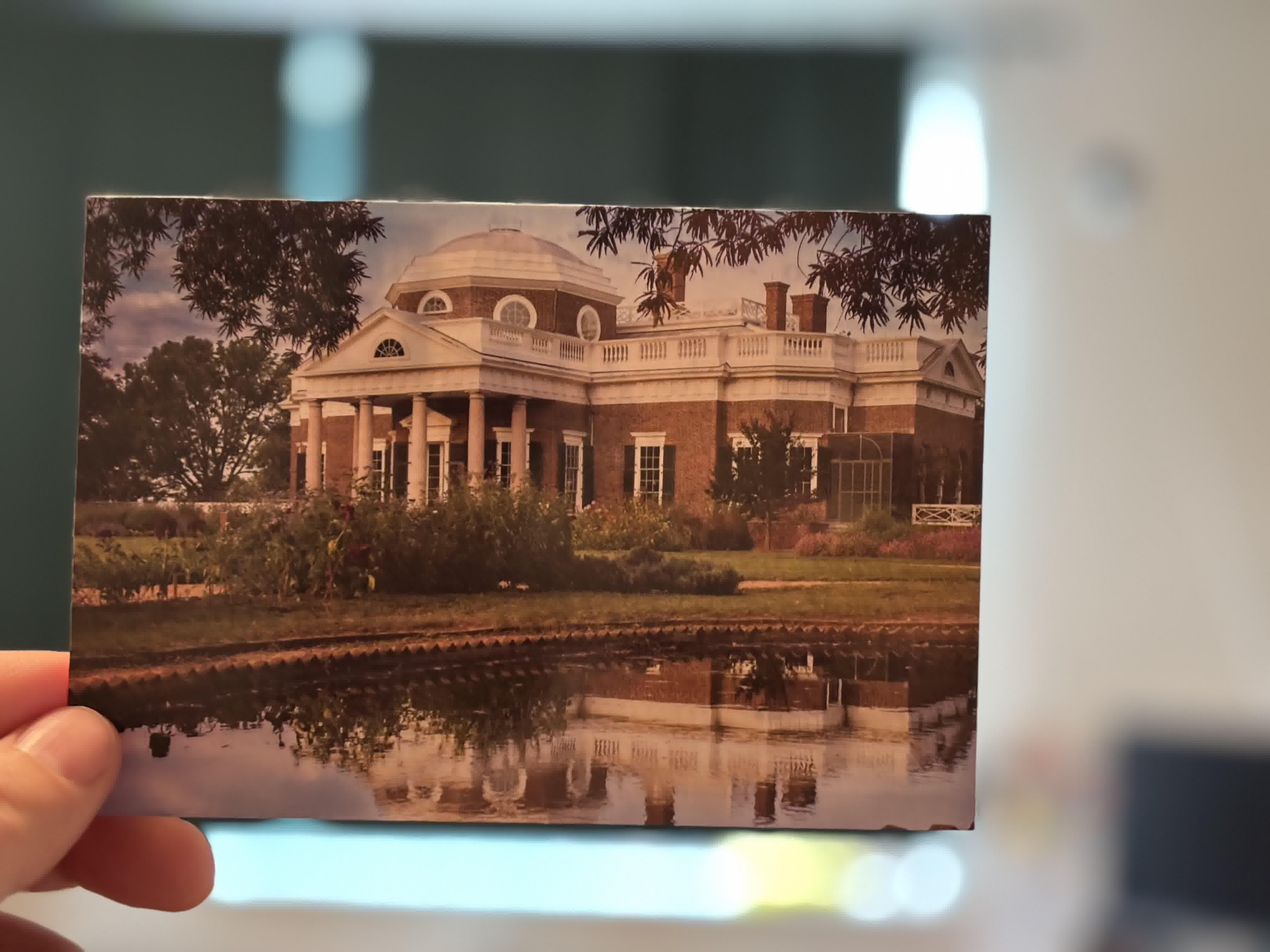This postcard is of Monticello (the building on the back of a nickel) and is being sent to Finland.